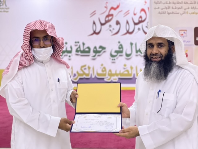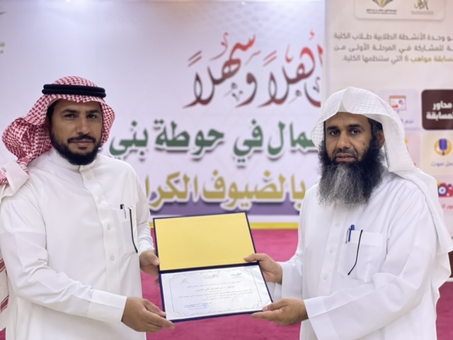 وفي ختام المسابقة ألقى عميد الكلية د. إبراهيم الداود كلمة أشاد فيها بهذه المسابقات، التي تبثّ التنافس بين الطلاب، موضّحًا أثرها في صقل مواهبهم، وتنمية قدراتهم، ومُوجّهًا شكره لعمادة شؤون الطلاب على جهودها المبذولة في هذا الشأن. كما قدّم د. الداود شكره للجنة تحكيم المسابقة، وسلّم لأعضائها شهادات التقدير.