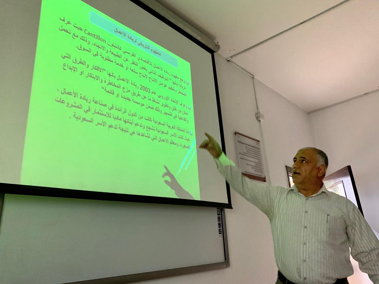 حرصًا من كلية المجتمع بالخرج على توعية الطلاب بمحاور الملتقى العلمي، وطريقة المشاركة فيه وتنفيذًا لتوجيهات سعادة عميد الكلية د. حمد بن عبدالله القميزي بأهمية تقديم ورش عمل تعريفية لتفعيل المشاركات الطلابية في الملتقى نظم نادي ريادة الاعمال بالكلية ورشة عمل بعنوان" المشروعات الريادية " من الفكرة الى الريادة " قدمها د. ياسر محمد علي الهبول الاستاذ المساعد بقسم إدارة الأعمال بالكلية وذلك يوم الخميس الموافق 3/7 /1441هـ و تناولت الورشة التعريف المفاهيم التالية: مفهوم ريادة الأعمال، وصفات رائد الأعمال ، ودور ريادة الأعمال في دعم التنمية بالمجتمع ، ومميزات ريادة الأعمال ، وتجارب دولية وإقليمية في مجال ريادة الأعمال: (التجربة الأمريكية، و التجربة السعودية )، ودور البنوك وجهات التمويل في دعم ريادة الأعمال، ونحو نموذج أمثل لدعم المشروعات الصغيرة والمتوسطة.