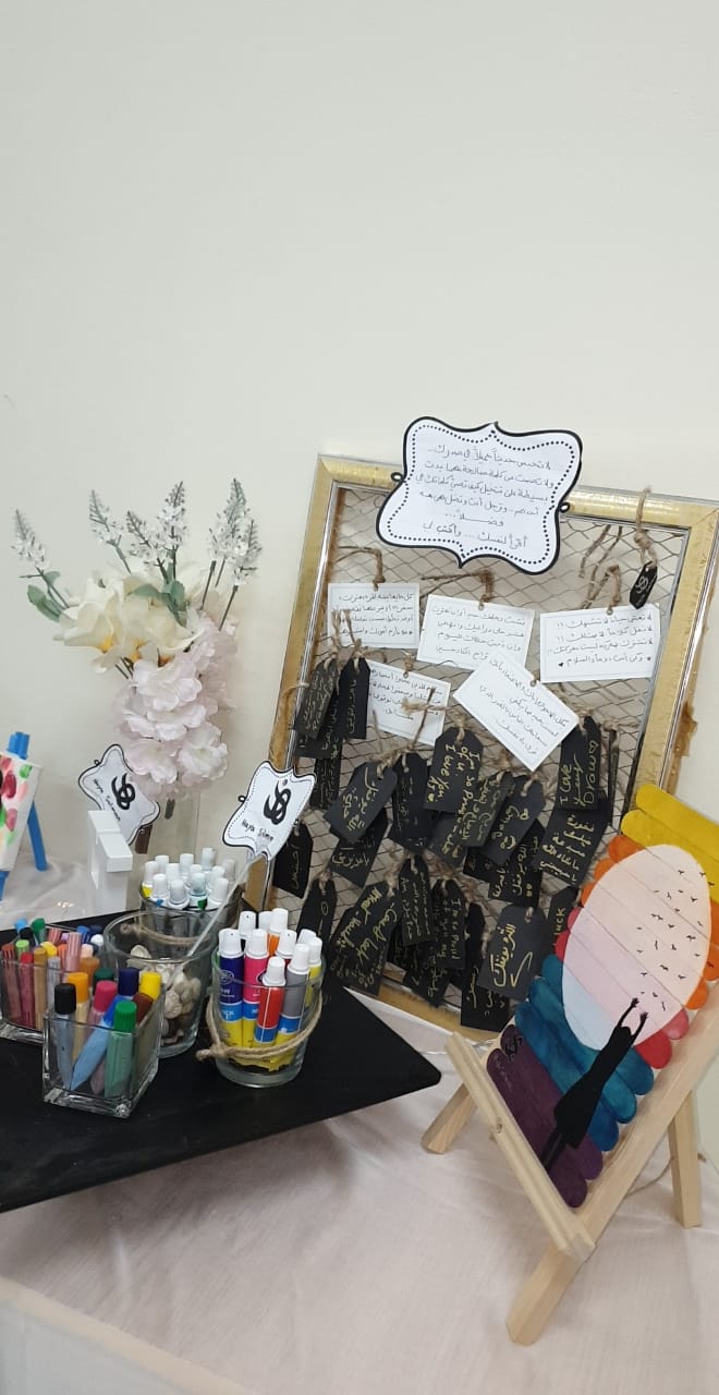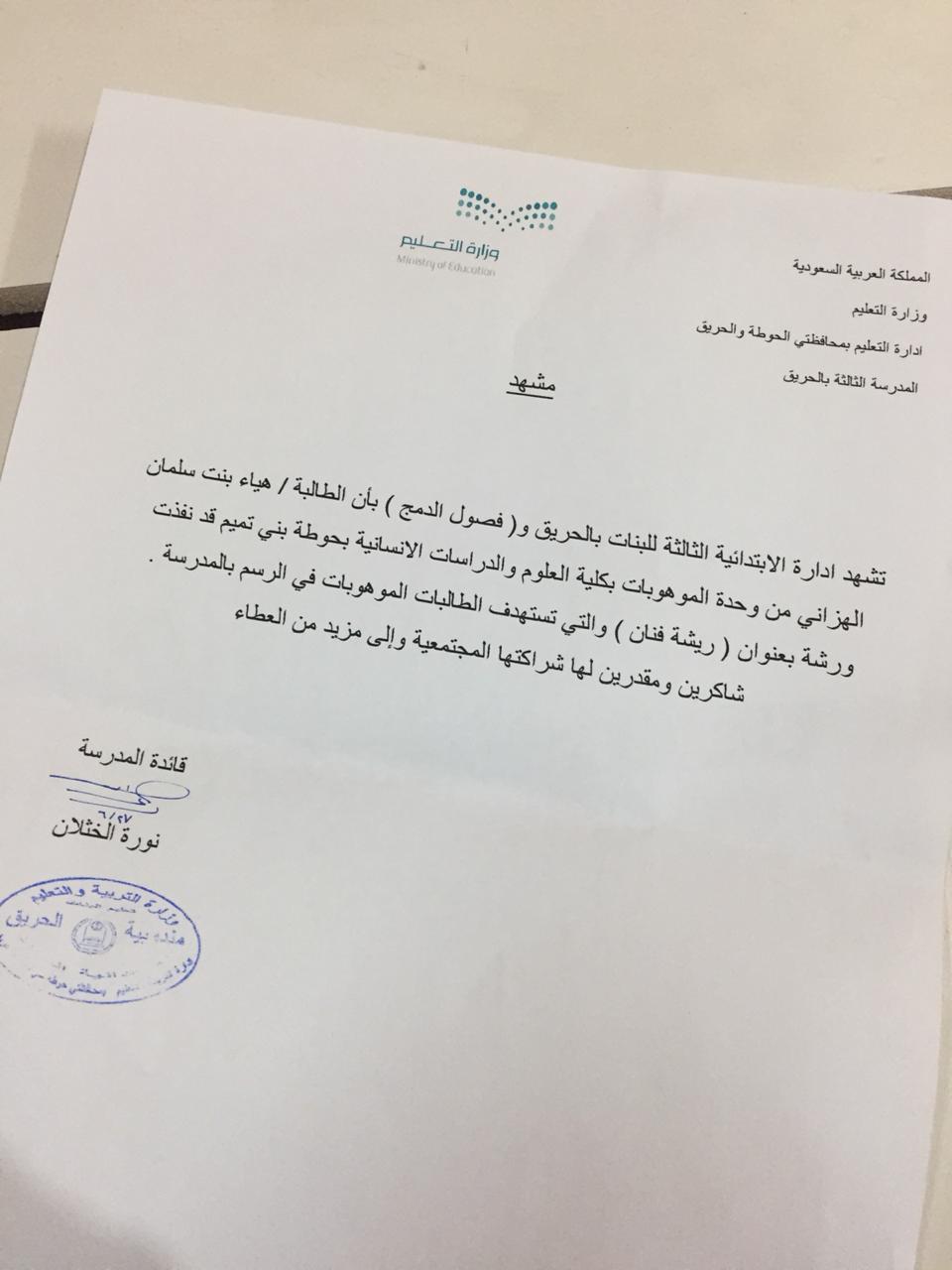 في ظل قيادة عميدة كلية العلوم والرداسات الإنسانية بحوطة بني تميم الدكتورة حصة بنت سعود الهزاني التي اولت عناية ودعم لامحدود بالطالبات الموهوبات و ذلك بإبراز مواهبهن وتطويرها قدمت الطالبة /هيا الهزاني من قسم اللغة الإنجليزية ورشة عمل بعنوان ( ريشة فنان) في المدرسة الابتدائية الثالثة بالحريق وذلك يوم الاثنين الموافق 26 / 6/ 1440 هـ بتمام الساعة التاسعة صباحاً. حيث جمعت قائدة المدرسة الأستاذة نوره الخثلان الطالبات الموهوبات بالمدرسة وهيأت لهن الظروف المناسبة للاستفادة من هذه الورشة وقد نالت على إعجاب الجميع لما فيها من فائدة للطالبات وابراز مواهبهن. الورشة من إشراف منسقات وحدة الموهوبات بالكلية ا/مها الصقعبي وا/منال الدحيم.