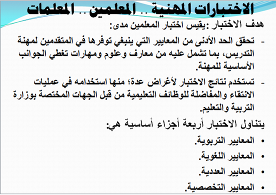 5. الالتحاق بالاختبارات التابعة للمركز الوطني للقياس والتقويم التي تؤهل الخريجة لمهنة التعليم.