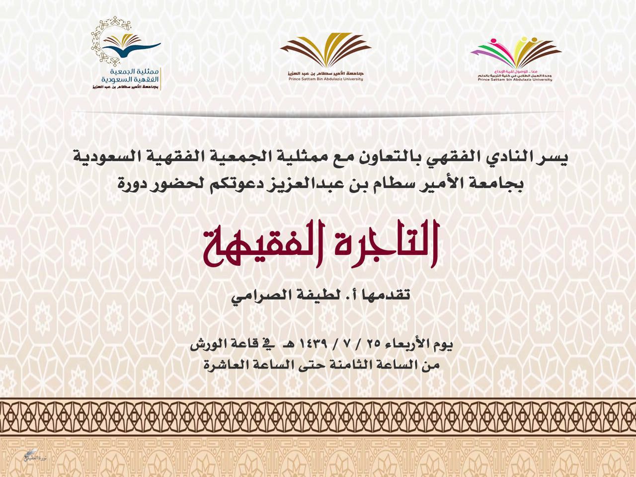 يسر النادي الفقهي بالتعاون مع ممثلية الجمعية الفقهية السعودية بالجامعة دعوتكم لحضور دورة بعنوان ((التاجرة الفقيهة)) تقدمها سعادة الأستاذة/ لطيفة الصرامي عضو هيئة التدريس بكلية التربية بالخرج قسم الدراسات الإسلامية ، والتي ستعقد من الساعة 8:00ص وحتى الساعة 10:00 ص بقاعة الورش يوم الأربعاء 25-7-1439هـ