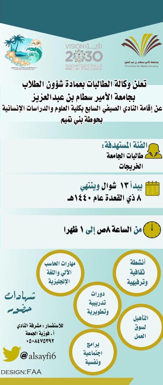 تعلن كلية العلوم والدراسات الإنسانية بحوطة بني تميم عن إقامة النادي الصيفي السابع التابع لوكالة الطالبات بعمادة شؤون الطلاب بالجامعة والممتد الفترة من 13 / 10/ 1440 هـ حتى 8 / 11/ 1440 هـ لمدة أربعة أسابيع، حيث يستهدف النادي جميع المهتمات بتطوير الذات من طالبات المرحلة الثانوية والجامعية والخريجات. تهدف برامج النادي الصيفي إلى تقديم البرامج المتنوعة والمفيدة من أنشطة ثقافية وترفيهية وبرامج لتطوير مهارات الحاسب الآلي واللغة الإنجليزية ودورات تدريبية تطويرية والتأهيل لسوق العمل بالإضافة إلى برامج اجتماعية ونفسية والتي سوف تساهم في رفع كفاءات المشاركات وتثقيفهن. يمنح النادي شهادات حضور باعتماد الجامعة ووقت الحضور سيكون من الساعة الثامنة صباحا إلى الساعة الواحدة ظهرا. فعلى الراغبات في الانضمام للنادي المبادرة حيث سيتم عرض كافة البرامج وآلية العمل بها من خلال اللقاء التعريفي الذي ستنظمه مشرفة النادي أ. فوزية الجمعة