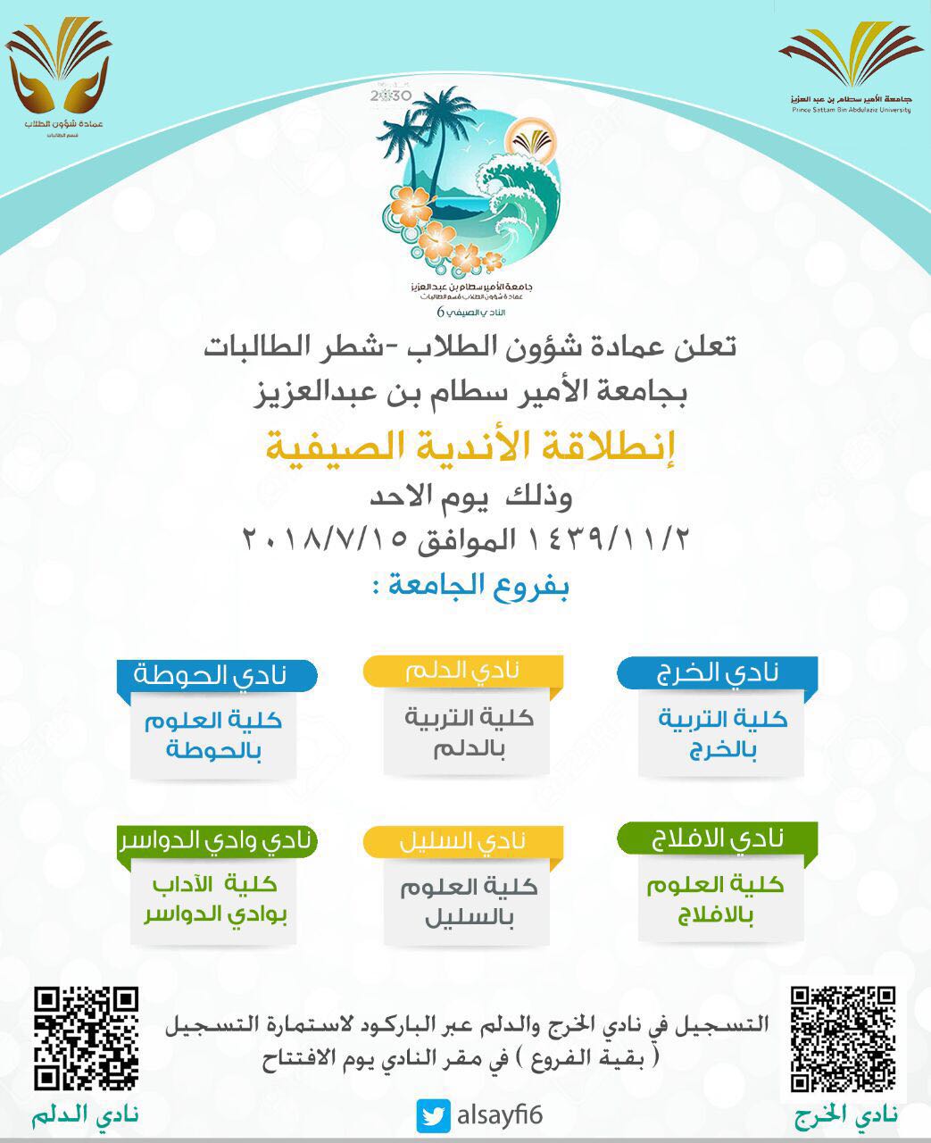 تشهد جامعة الأمير سطام بن عبدالعزيز بفروعها الستة في الخرج والدلم وحوطة بني تميم والأفلاج ووادي الدواسر والسليل، انطلاق فعاليات النادي الصيفي السادس، المخصص لطالبات الجامعة ومن في حكمهن من المجتمع المحلي، يوم الأحد 2/ 11/ 1439ه، 15/ 7/ 2018م. وقد اعتمد للنادي 529 ساعة تدريبية، موزعة على 96 برنامجًا تدريبيًا متنوعًا، توزعت على الحاسب الآلي، واللغة الإنجليزية، وبرامج تطويرية، وبرامج في خدمة المجتمع والعمل التطوعي، وبرامج تأهيلية لسوق العمل، والبرامج الرياضية والصحية، إضافة إلى عدد من الفعاليات الوطنية والبرامج الترفيهية المميزة. ويسعى النادي إلى ترسيخ المبادئ الإسلامية، وقيم الانتماء الوطني، وتعزيز الوحدة الوطنية، وتنمية القيم الوجدانية والمهارية والتطوعية، إضافة إلى الترفية والمسؤولية الاجتماعية لدى الطالبات، بما يحقق الأهداف والرؤى التي تتطلع رؤية المملكة 2030 إلى تحقيقها وقياسها. ويحظى النادي بمتابعة وإشراف مباشر من قسم الطالبات بعمادة شؤون الطلاب، وهو ما دأب عليه القسم في السنوات الخمس السابقة، فمنحه فرصًا ومجالًا لتطوير البرامج والدورات، وزيادة الساعات التدريبية. يذكر هنا أن النادي قد حقق فيما سبق نجاحات متعددة وتطوّرًا متزايدًا، وهو ما يؤمل أن يحققه النادي السادس هذا العام.