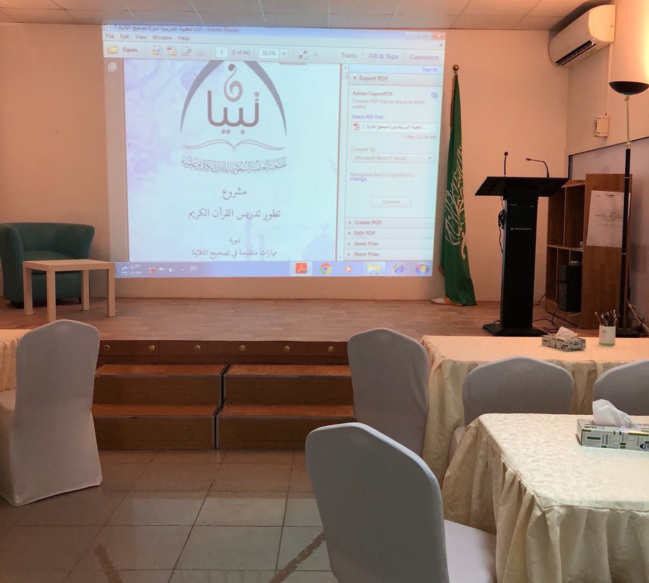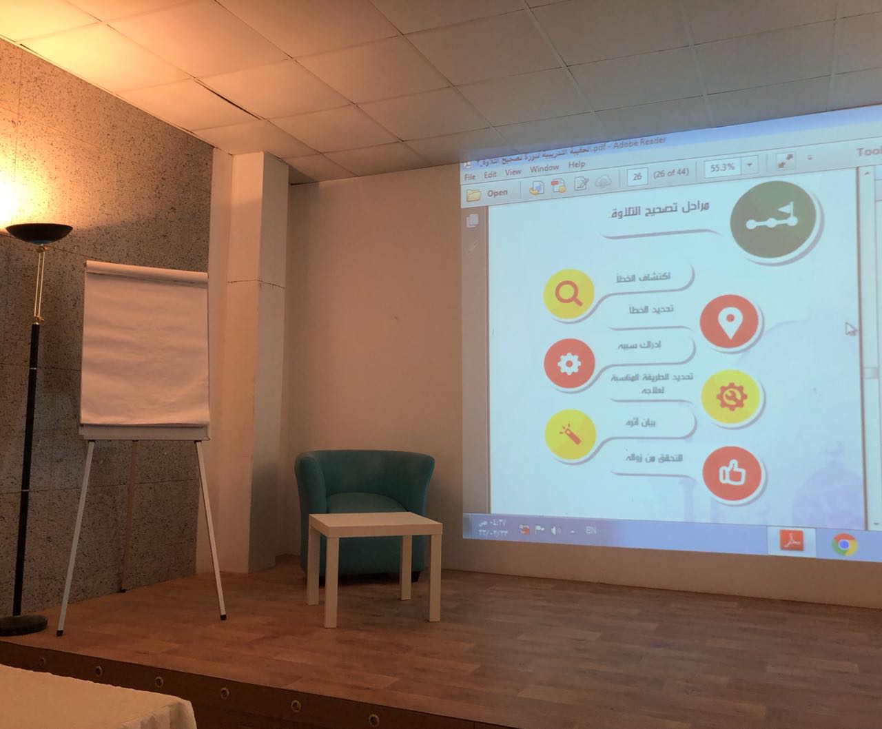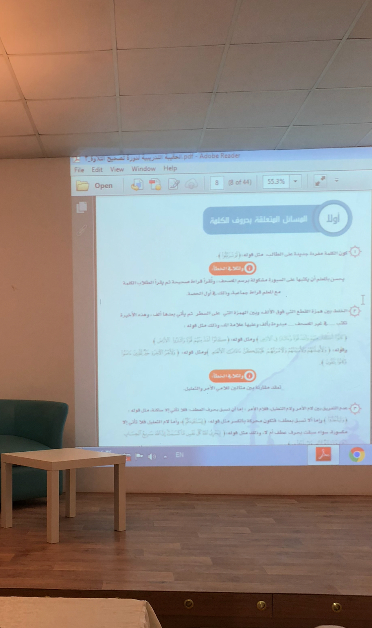 واهتمامًا بالقرآن الكريم وتجويد تلاوته، قدمت المدربة سارية الرفاعي، يوم الأربعاء 5/ 11، برنامج "مهارات متقدمة في تصحيح التلاوة"، استهدف تصحيح التلاوة للمشاركات، والتعرف إلى بعض الكلمات التي تمر في أثناء التلاوة، وتنوّع طريقة تصحيح التلاوة بتنوّع أسباب الخطأ، ومعرفة المسائل المتعلّقة برسم الكلمة وحروفها وحركاتها.