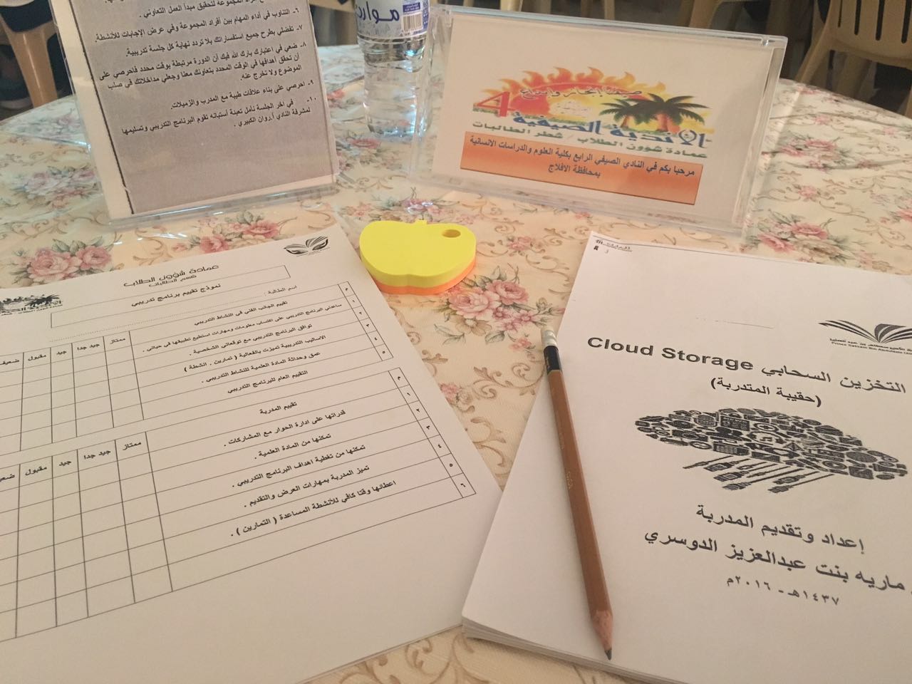 نظم النادي الصيفي بكلية العلوم والدراسات الإنسانية بالأفلاج اليوم الأحد 1437/10/19هـ دورة تدريبية بعنوان ( التخزين السحابي ) للأستاذة : مارية الدوسري , افتتحتها بسرد تعليمات البرنامج التي تساهم في نجاحه ومن ثمَ عرضت صور لبرامج وأدوات التخزين التقليدية الشائعة التي قد تتعرض للفقدان والتلف , بعد ذلك طرحت بدائل آمنه لتخزين وحفظ المعلومات , ومن هذه البدائل البرامج المنسدلة من قائمة التخزين السحابي , تحدثت عن هذه البرامج وعرفتها و لماذا سميت بهذا الاسم وطرق استخدامها , كما تطرقت لعيوبها ومميزاتها , بعدها تناولت أحد هذه البرامج بشكلاً مفصل , حيث شرحت فوائده و التعامل معه وكيفية استغلاله , وطبقت ذلك عملياً مع المتدربات خطوة بخطوة , كما استخدمت في دورتها طرق التعلم النشط , وفي ختام الدورة فتح المجال للنقاش والإجابة على تساؤلات الحضور .