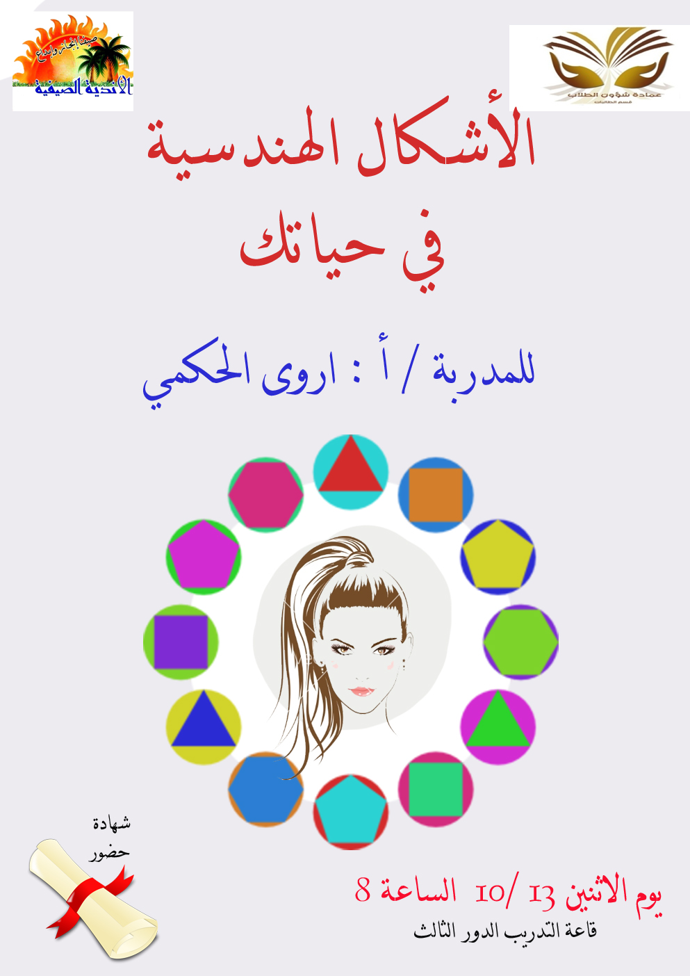 اختتم النادي الصيفي الرابع بالخرج أنشطته وفعالياته للأسبوع الأول بنجاح كبير, وكان قد استهلّها يوم الإثنين 13 /10/ 1437ه بدورة تدريبية بعنوان: (الأشكال الهندسية في حياتك) قدمتها الأستاذة المدربة أروى أحمد الحكمي، واستهدفت الدورة استكشاف تمييز شخصيات الآخرين عن طريق هذه الأشكال، ومدى تأثيرها في العلاقات التواصلية بين الناس.