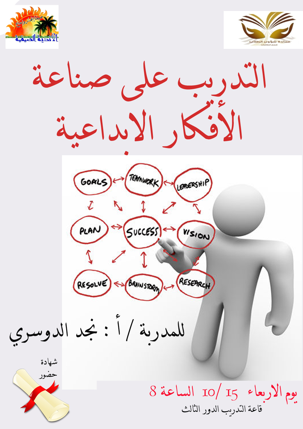 وفي يوم الأربعاء قدّمت المدربة الأستاذة نجد عبد الله الدوسري دورة بعنوان: (صناعة الأفكار الإبداعية)، استهدفت توضيح كيفية النظر إلى الأشياء المألوفة بنظرة جديدة، وإبداعها، وتأصيلها، ومعالجة القضايا بطريقة أكثر مرونة.