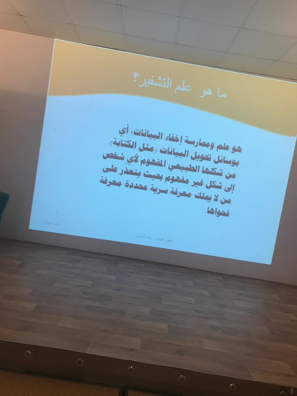 وعلى مدى يومي الثلاثاء والأربعاء 22، 23/ 10، تعرّفت المتدربات إلى مفهوم تشفير البيانات، وإلى "الباركود"، وكيفية قراءة الكود، وإلى أهمية التشفير وفكّ الشيفرات. في دورة متخصصة في (تشفير البيانات)، قدمتها لهن المدربة: أ. وفاء العمري.
