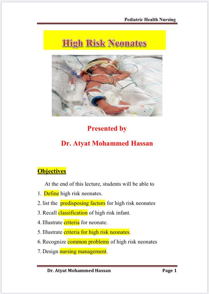 وقد حضر المحاضرة طالبات امتياز التمريض بالمستشفي و طالبات المستوي الثامن بالكلية. وقد هدفت المحاضرة على إكساب و رفع المهارات العلمية والتطبيقية لدى الطالبات أثناء تقديم العناية التمريضية للأطفال حديثي الولادة المعرضين للخطر. وقد تم مناقشة التعريف، عوامل الخطورة، التصنيفات، المواصفات، أيضا تم مناقشه أشهر المشكلات لدى الأطفال المعرضين: Prematurity, postmaturity, hypothermia, hyperthermia, hypoglycemia, hyperbilirubinemia, idiopathic respiratory distress syndrome, and neonatal sepsis. Finally, discussing the general nursing management of high risk neonates using the nursing process. وقد لاقت المحاضرة اهتمام وترحيب من الطالبات.