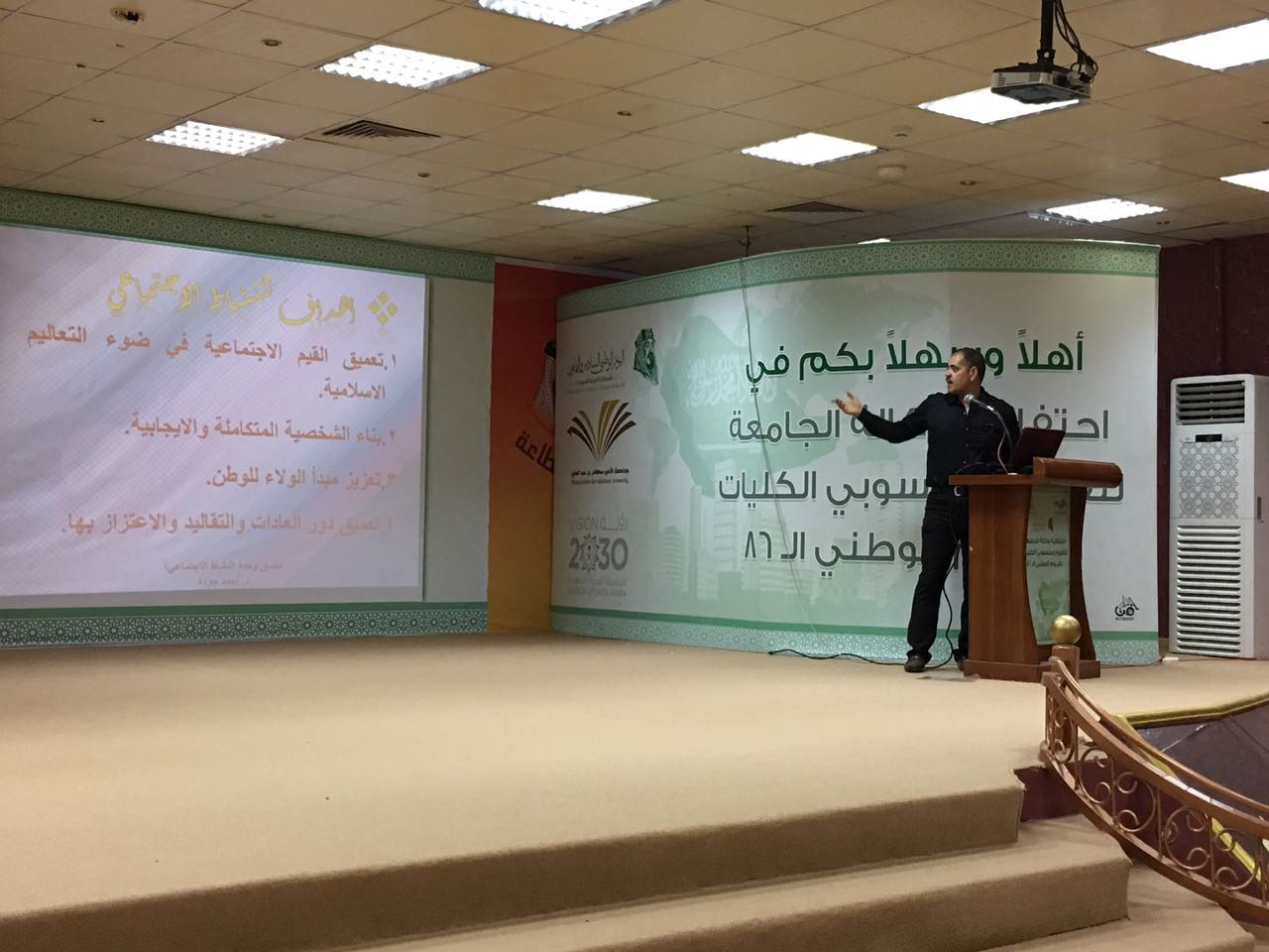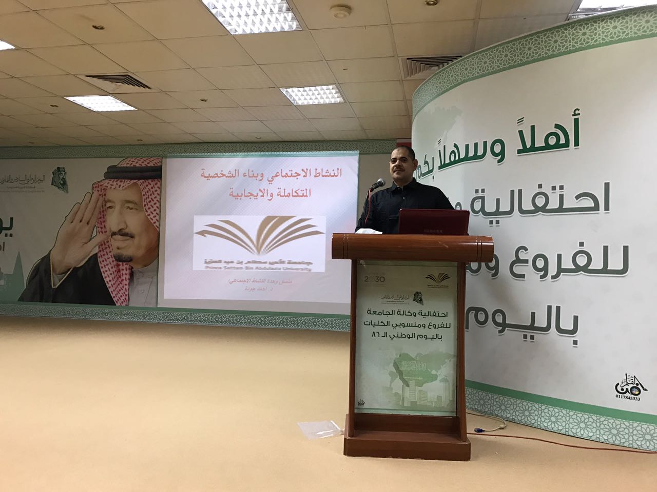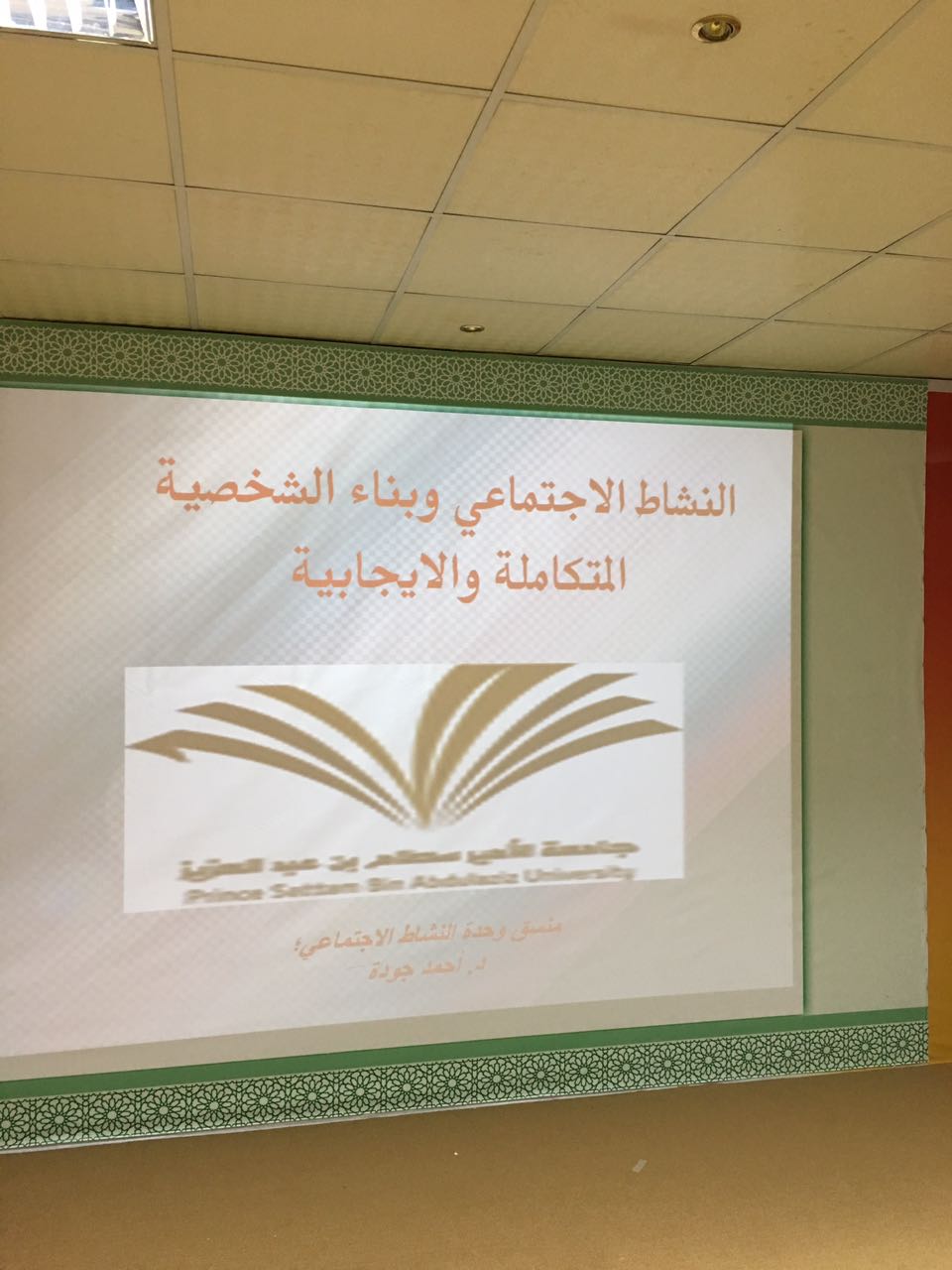 بتوجيهات عميد كلية الآداب والعلوم بوادي الدواسر د. سفر بن بخيت المدرع ألقى د. أحمد جودة عضو هيئة التدريس منسق شعبة النشاط الاجتماعي بالكلية ندوة في مسرح كلية الاداب والعلوم بعنوان النشاط الاجتماعي وبناء الشخصية المتكاملة والإيجابية تناول فيها جوانب بناء الشخصية الفاعلة، بحضور أعضاء هيئة التدريس وعدد من طلاب الكلية .