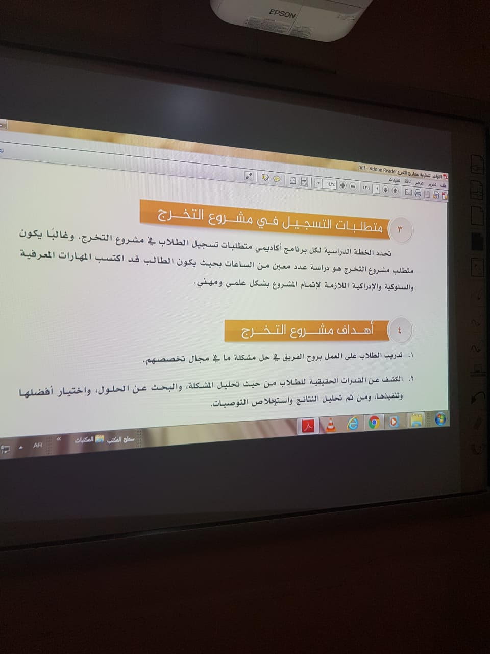 حيث هدفت الورشة لتعريف الطالبات بمشروع التخرج وكيفية التسجيل به وتم توضيح دور ومسؤوليات الطالبة في المشروع وتوضيح الجدول الزمني لتنظيم مشاريع، كما تم تعريف الطالبات بدور منسقة مشاريع التخرج بالكلية ولجان المشاريع ومشرفة المشروع، كما تم الحديث عن النماذج وتقارير المتابعة وكيفية تقييم المشاريع، وقد شهدت المحاضرة تفاعل كبير من الطالبات حيث طرحن بعض الأسئلة المتعلقة بالمحاضرة وناقشن أهم المحاور التي طرحت فيها.