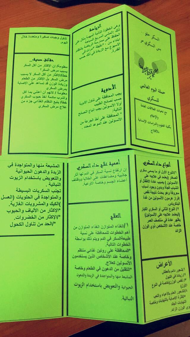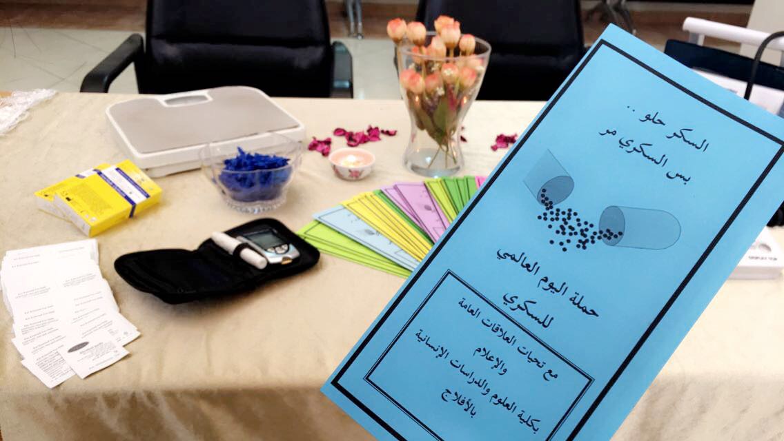 نظمت العلاقات العامة والإعلام بكلية العلوم والدراسات الإنسانية بالأفلاج اليوم الأربعاء 1438/2/23 هـ في تمام الساعة التاسعة ببهو المبنى الرئيسي محاضرة بعنوان ( السكر حلو .. لكن السكري مر ) , قدمتها طبيبة الكلية د: مناهل محمد صديق , ضمن حملة اليوم العالمي للسكري , عرفت بطبيعة المرض , ومنهم أكثر عرضة له , كما سردت علامات الإصابة به , وكيفية الوقاية منه –بإذن الله – و طريقة تناول الأدوية الخاصة به , كما ذكرت بعض الطرق الطبيعية للحفاظ على مستوى السكري بالدم , وفي ختام المحاضرة أجابت عن أسئلة الحضور و قامت بالكشف والاطمئنان على صحتهم , حضر عدد من أعضاء هيئة التدريس و الكادر الإداري وعدد كبير من الطالبات , تهدف المحاضرة إلى زيادة الوعي الثقافي لديهم , كما قدمت مساعدة العميد د: وصال عز الدين شهادة شكر للطبيبة على جهودها المبذوله في خدمة الكلية .