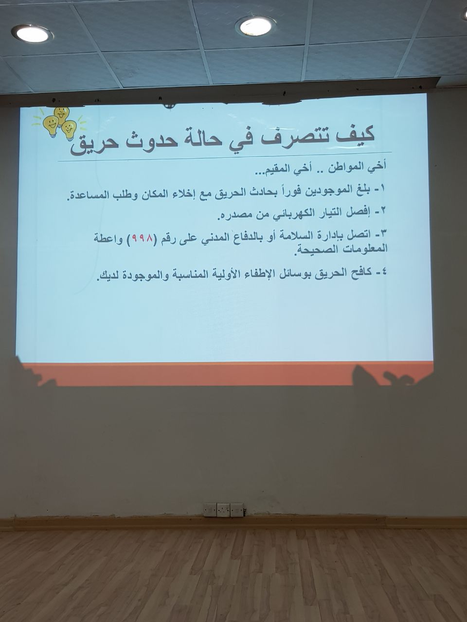 بتوجيه من مدير إدارة السلامة أ. محمد بن عبد المطلوب حمدان وامتداداً لخطط إدارة السلامة الاستراتيجية وفي إطار تدريب لجان السلامة ولجان الاخلاء في الكليات،نفذت إدارة السلامة برنامجاً تدريبياً بعنوان (إدارة الأزمات والمخاطر) بكلية العلوم الطبية التطبيقية (أقسام الطالبات) يوم الأحد الموافق 1439/7/8هـ في تمام الساعة العاشرة صباحاً،وقد قدمت البرنامج مساعدة مدير إدارة السلامة أ/ بنان محمد الموينع والمشرفات أ/ فاطمة الدوسري وأ/ فاطمة الحجي وأ/ فاطمة الشمشير.