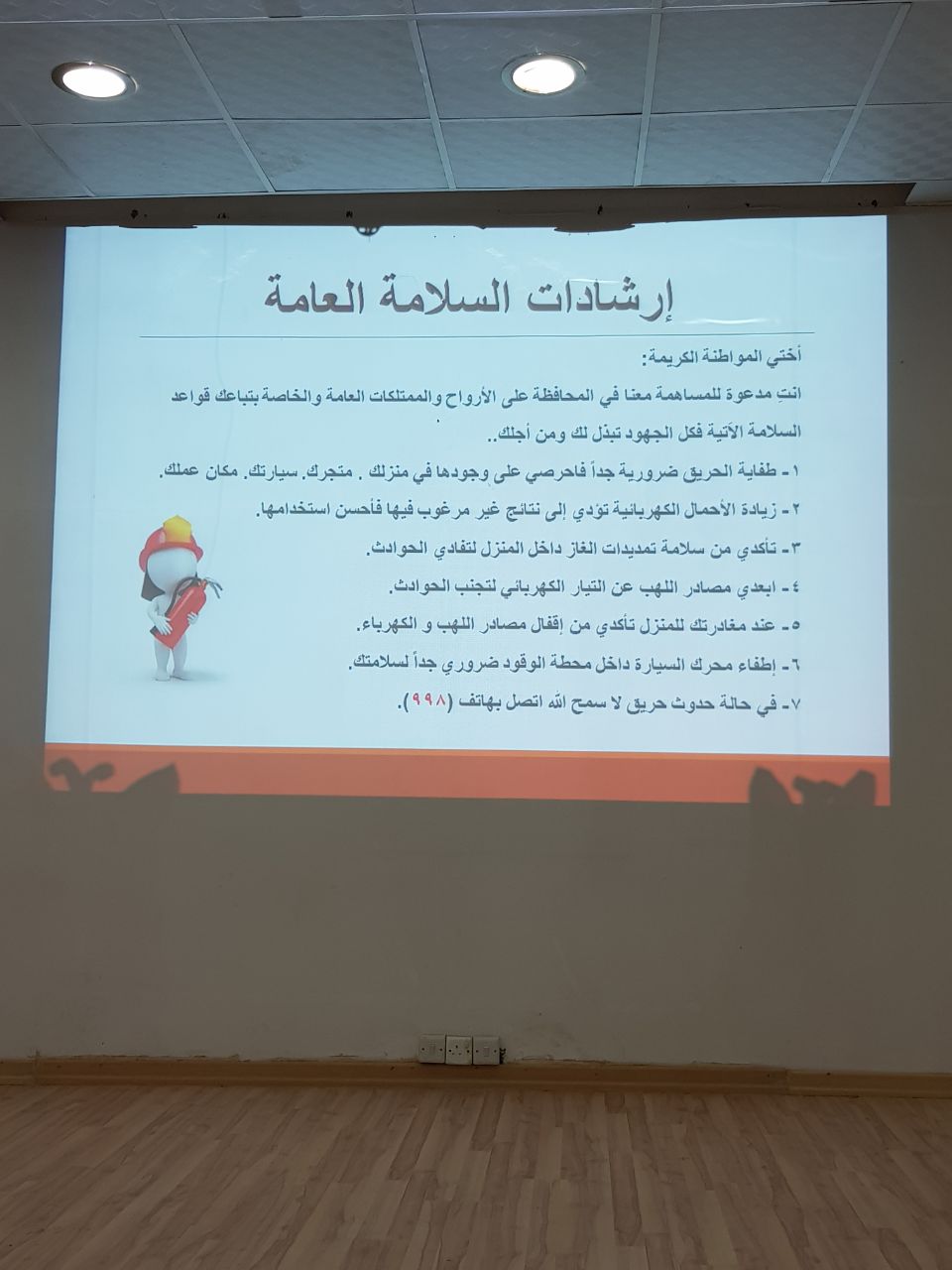 تضمن البرنامج الحديث حول الأزمة تعريفها وتصنيفاتها وعوامل نجاحها، كما تضمن البرنامج شرحاً مفصلاً عن الحرائق أنواعها وطرق التعامل معها وأنواع طفايات الحريق وطرق استخدامها وختم البرنامج بتدريب عملي للحاضرات على استخدام طفاية الحريق من قبل مشرفات السلامة , كما تم توزيع المنشورات التوعوية على الحضور .