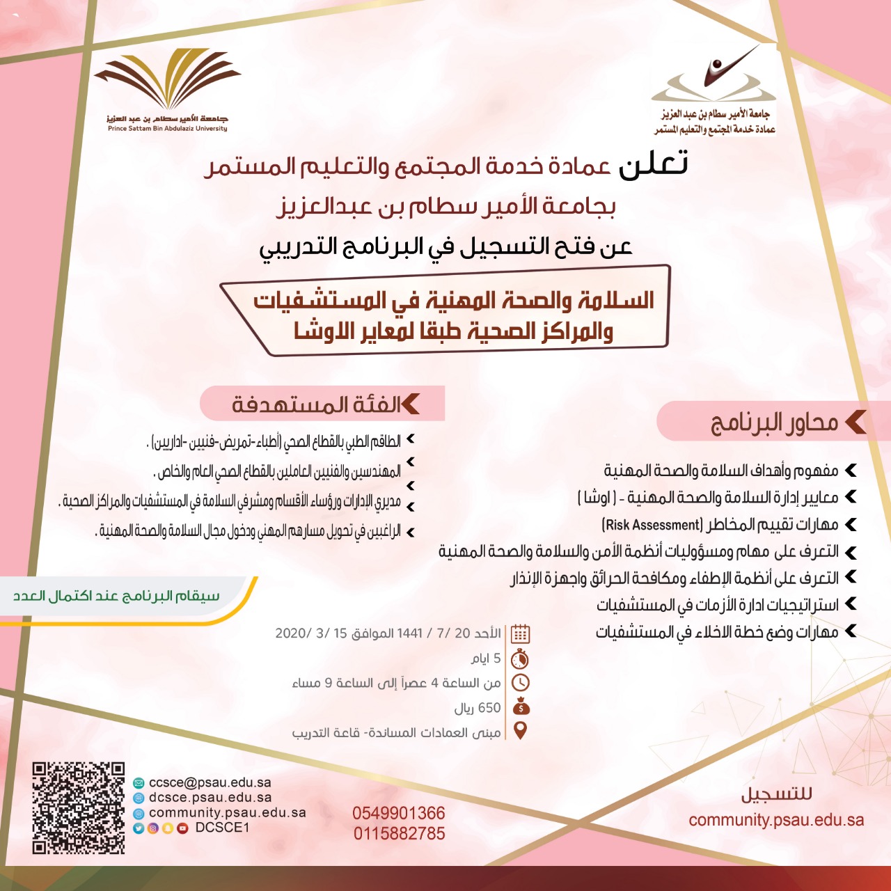 يبدأ البرنامج الأحد 20/07/1441هـ (15/03/2020م) من الساعة 4مساءً وحتى 9 مساءً لمدة خمسة أيام في قاعة التدريب بمبنى العمادات المساندة.