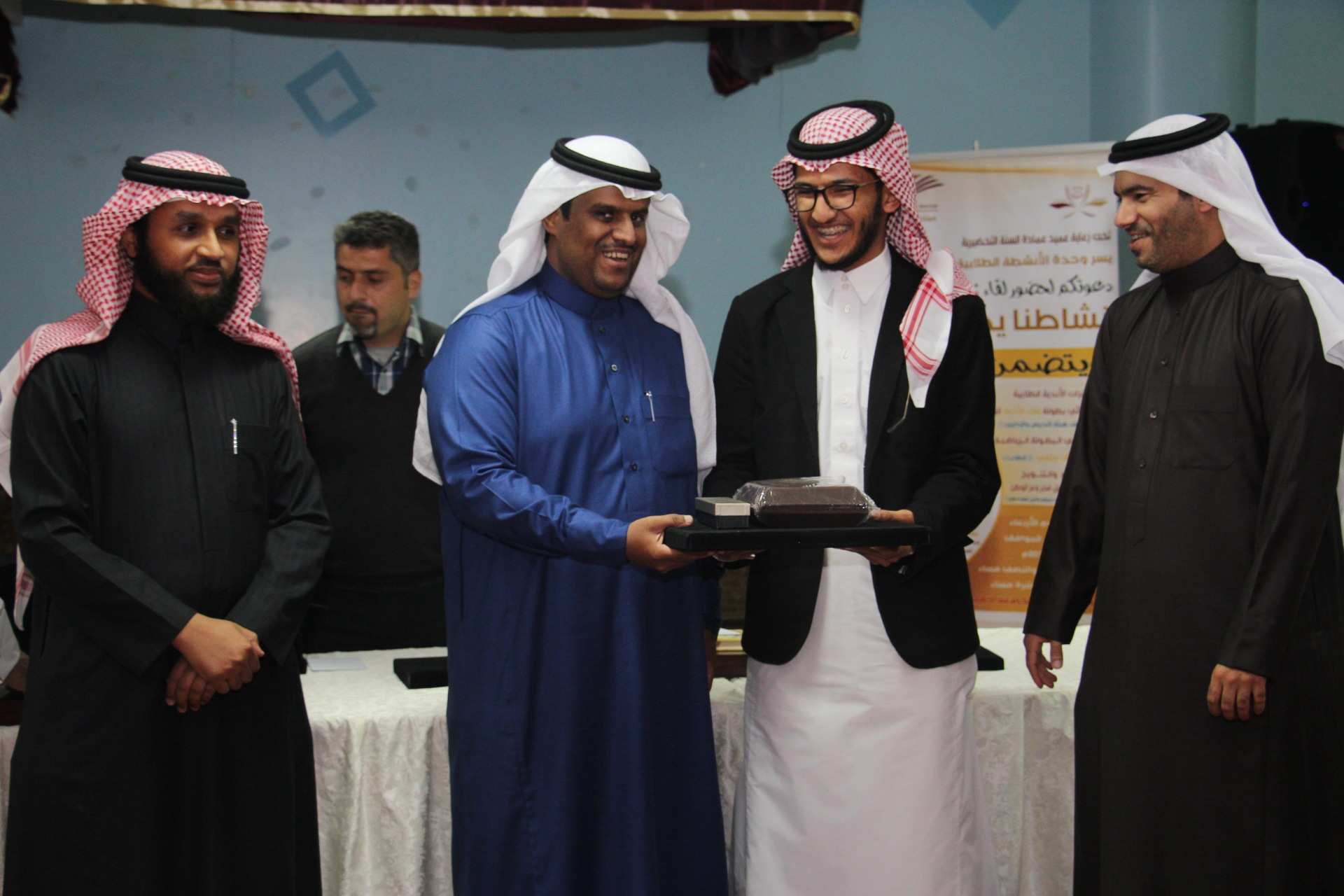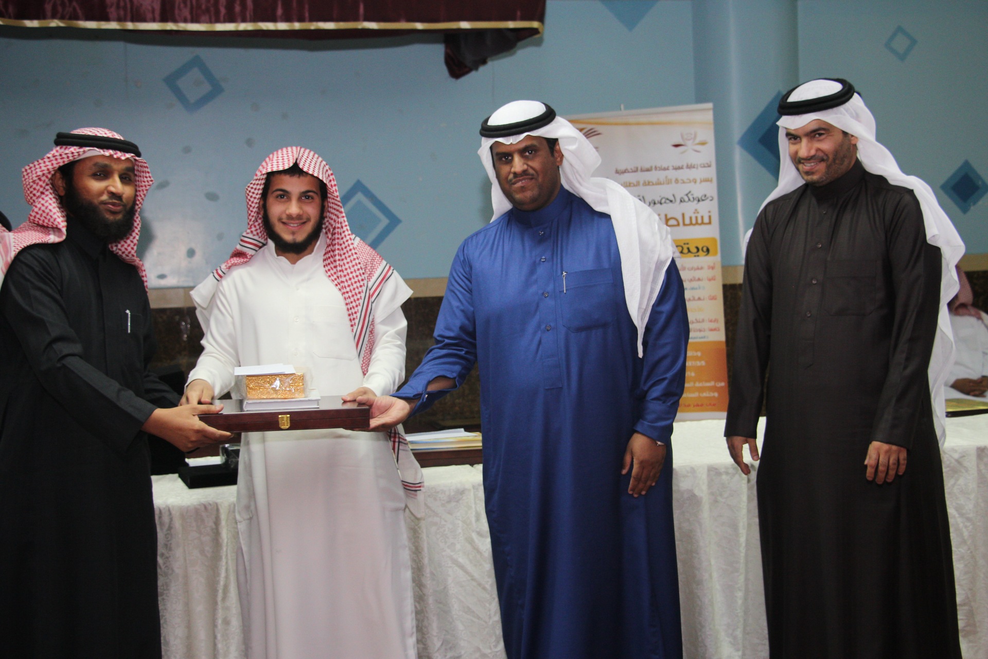 وفي يوم تالي قام عميد عمادة السنة التحضيرية سعادة الدكتور مشاري بن عياد العصيمي ووكيل عمادة السنة التحضيرية سعادة الدكتور فهد بن سعد السهلي ومساعد عميد شؤون الطلاب للأنشطة سعادة الأستاذ جمال الحمداء بتكريم الطلاب الحاصلين على المراكز الأولى في كلا المسابقتين ضمن لقاء عام ( نشاطنا يجمعنا) جمع منسوبي العمادة .