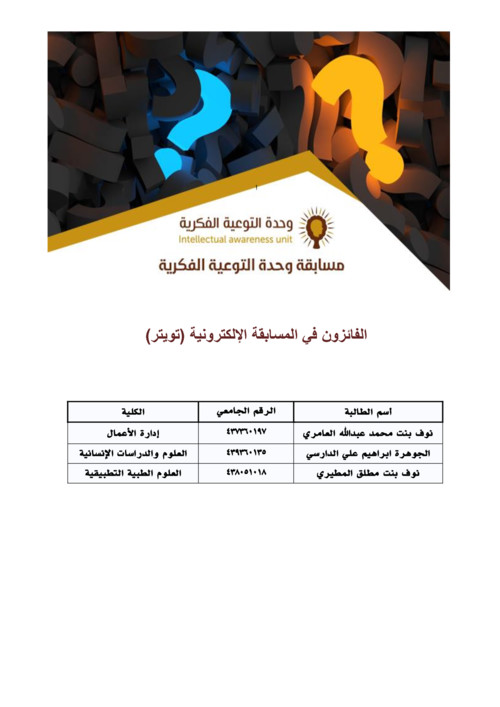بحضور رئيس وحدة التوعية الفكرية تم السحب على المسابقة الإلكترونية في تويتر للإسبوع الثالث وكان السؤال كالتالي اختر الإجابة الصحيحة : المرأة التي زوجها الله لنبيه محمد صلى الله عليه وسلم من فوق سبع سماوات وبدون مهر ولا عقد نكاح ولا شهود هي : 1- حمنة بنت جحش رضي الله عنها 2- سودة بنت زمعة رضي الله عنها 3- زينب بنت جحش رضي الله عنها 4- ميمونة بنت الحارث رضي الله عنها ، وكانت إجابتة الصحيحة الفقرة رقم ( 3) وتم اختيار الفائزين بإجراء القرعة الإلكترونية بينهم ، وكان عدد الفائزين ثلاثة فائزين وقيمة الجائزة 300 ريال لكل فائز .
