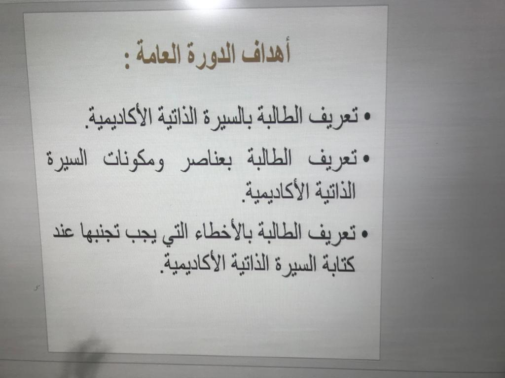 أقام قسم العلوم التربوية بالتعاون مع وحدة العمل الطلابي في يوم الأثنين 16-6-1441هـ, دورة بعنوان " السيرة الذاتية الأكاديمية " قدمتها الدكتورة /نوال الرشود الأستاذ المساعد بقسم العلوم التربوية بكلية التربية بالخرج. وهدفت إلى التعريف بالسيرة الذاتية الأكاديمية و أهميتها و أغراضها.والتعريف بخطوات كتابة السيرة الذاتية الأكاديمية . والتنبيه إلى الأخطاء التي يجب تجنبها عند كتابة السيرة الذاتية الأكاديمية . وقد حضر الدورة عدد من الطالبات بالكلية .
