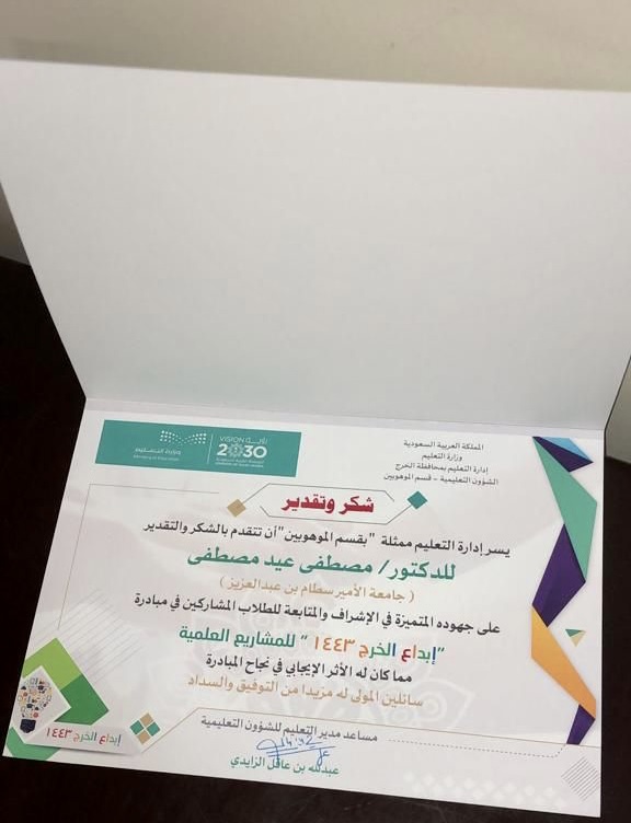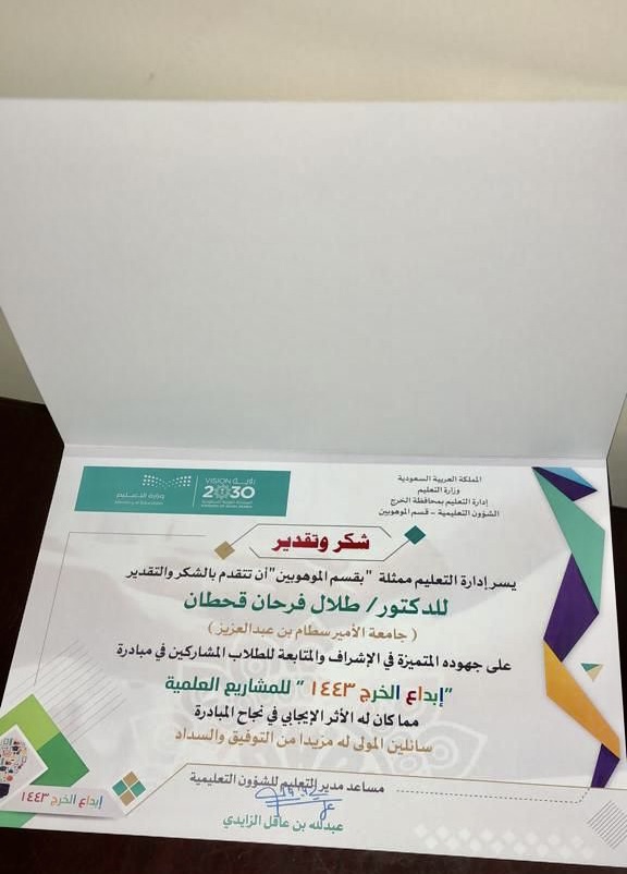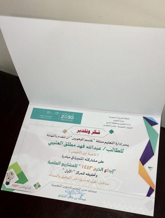حصل الموهوب عبدالله بن فهد العتيبي الطالب بثانوية ابن النفيس بمحافظة الخرج وأحد طلاب برنامج التلمذة؛ الذي تقدمه وحدة رعايةالموهوبين بعمادة شؤون الطلاب بجامعة الأمير سطام بن عبدالعزيز؛ على المركز الأول بمبادرة إبداع الخرج للمشاريع العلمية بمجالالهندسة البيئية؛ لعام ١٤٤٣هـ، وذلك على مشاركته بمشروع بحثي بعنوان "أسطح مطلية بمواد نانونية مضادة للبكتيريا ذاتية التنظيف تحتضوء الشمس".
