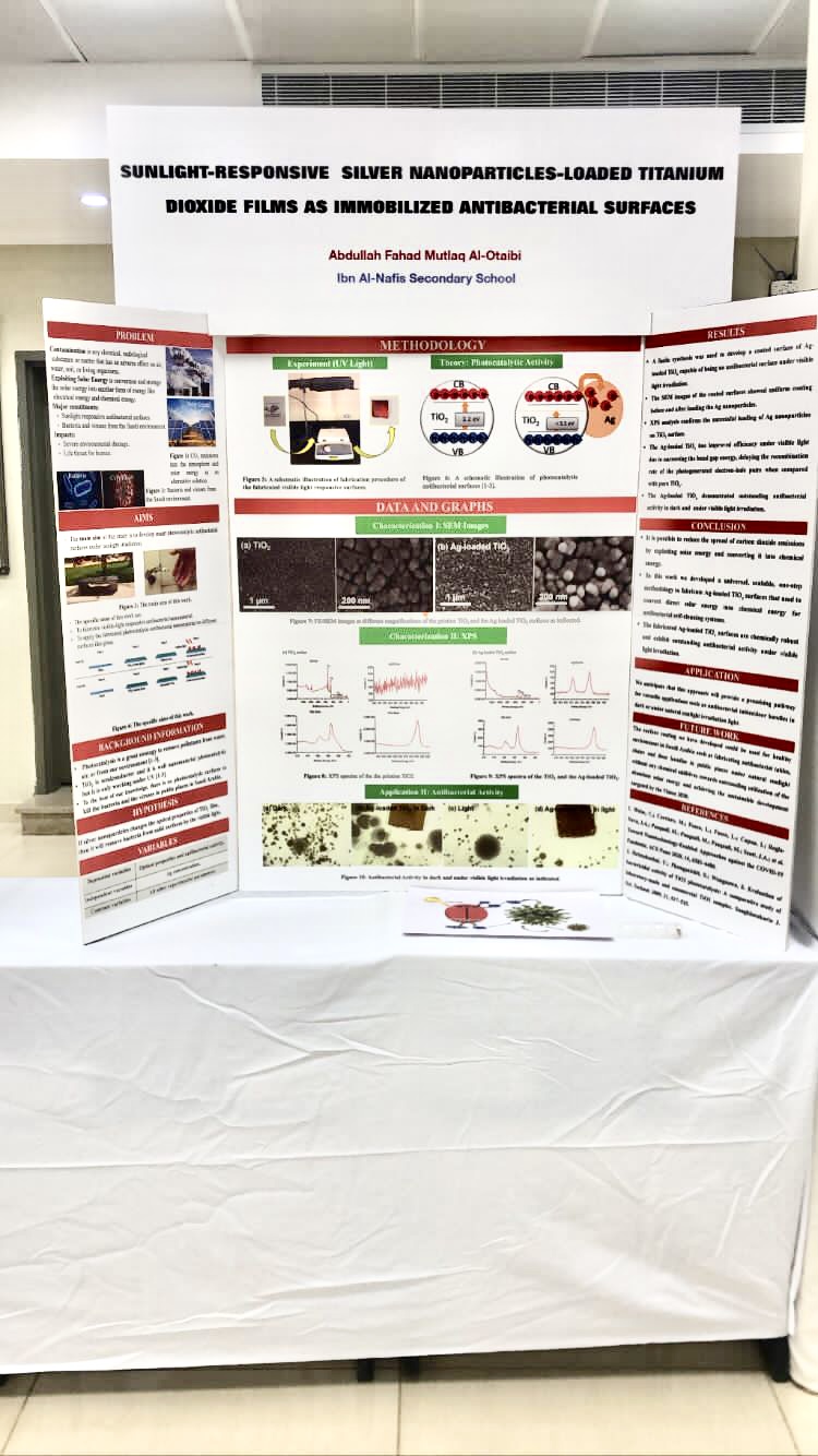 المشروع البحثي يهدف لتطوير أسطح مطلية، بجزيئات الفضة النانونية المحمل بثاني أكسيد التيتانيوم، والمضادة للبكتيريا والفيروسات تحتضوء الشمس الطبيعي؛ ويعتبر المشروع أحد مخرجات برنامج التلمذة الذي أُطلقَ بالفصل الدراسي الثاني للعام الحالي 1443هـ كأحدبرامج وحدة رعاية الموهوبين التي تستهدف طلاب الجامعة وطلاب التعليم العام.
