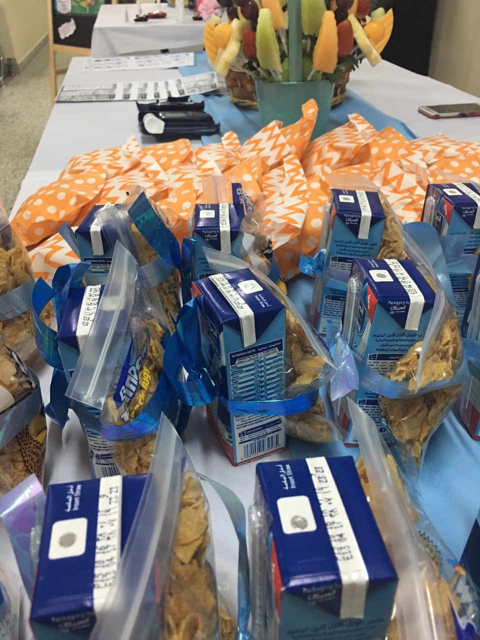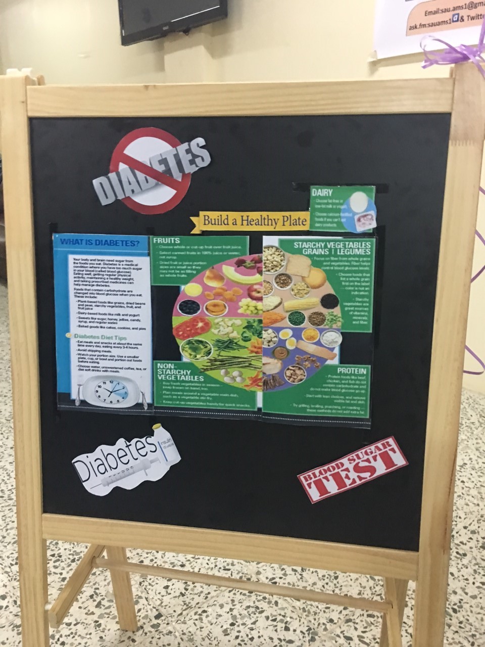 أقام نادي المختبرات الطبية يوم الثلاثاء 2/29/ 1438هـ بإشراف من الأستاذة : آلاء الطيب مشرفة النادي نشاطاً يهدف إلى التوعية عن مرض السكري ومدى خطورته وسرعة انتشاره في الوقت الحاضر وذلك بعنوان (التعامل الذكي مع مرض السكري) وذلك بالمدخل الرئيسي للكلية حيث تم عرض أمثلة الغذاء الصحي وجهاز قياس السكر في الدم لا تسبب ضرر عند تناولها . كذلك تم عرض أمثلة للوجبات الغير صحية والتي يوجد بها كميات كبيرة من السكر والتي قد تضر مريض السكر والشخص السليم على حد سواء مع عرض لنسب السكر الموجودة فيها .