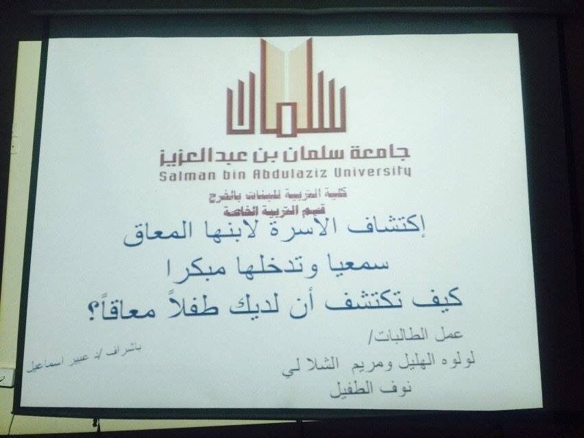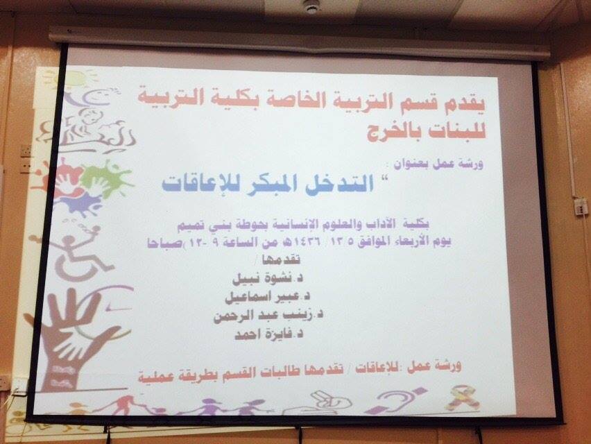 25.0pt;font-family:"AL-Mohanad Bold"" xml:lang="AR-SA">بدأت الورشة بمحاضرة قدمتها د. فايزة أحمد حيث تحدثت عن طرق التعرف على التوحد وأعراضه وطرق الاكتشاف المبكر، وكيفية التعامل مع الطفل المصاب بالتوحد، ثم قدمت د. نشوى نبيل محاضرة عن اضطراب وفرط النشاط ونقص الانتباه عند الأطفال وأعراضه وكيفية علاجه، وقدمت د. زينب عبد الرحمن كيفية وقاية الأطفال من الإعاقة الفكرية، ثم قدمت د. عبير إسماعيل محاضرة عن الإعاقة السمعية وسبل التواصل مع ذوي الإعاقة السمعية. بالإضافة الى مشاركة طالبات من كلية التربية بالخرج