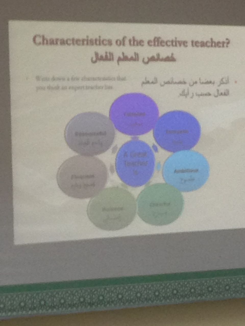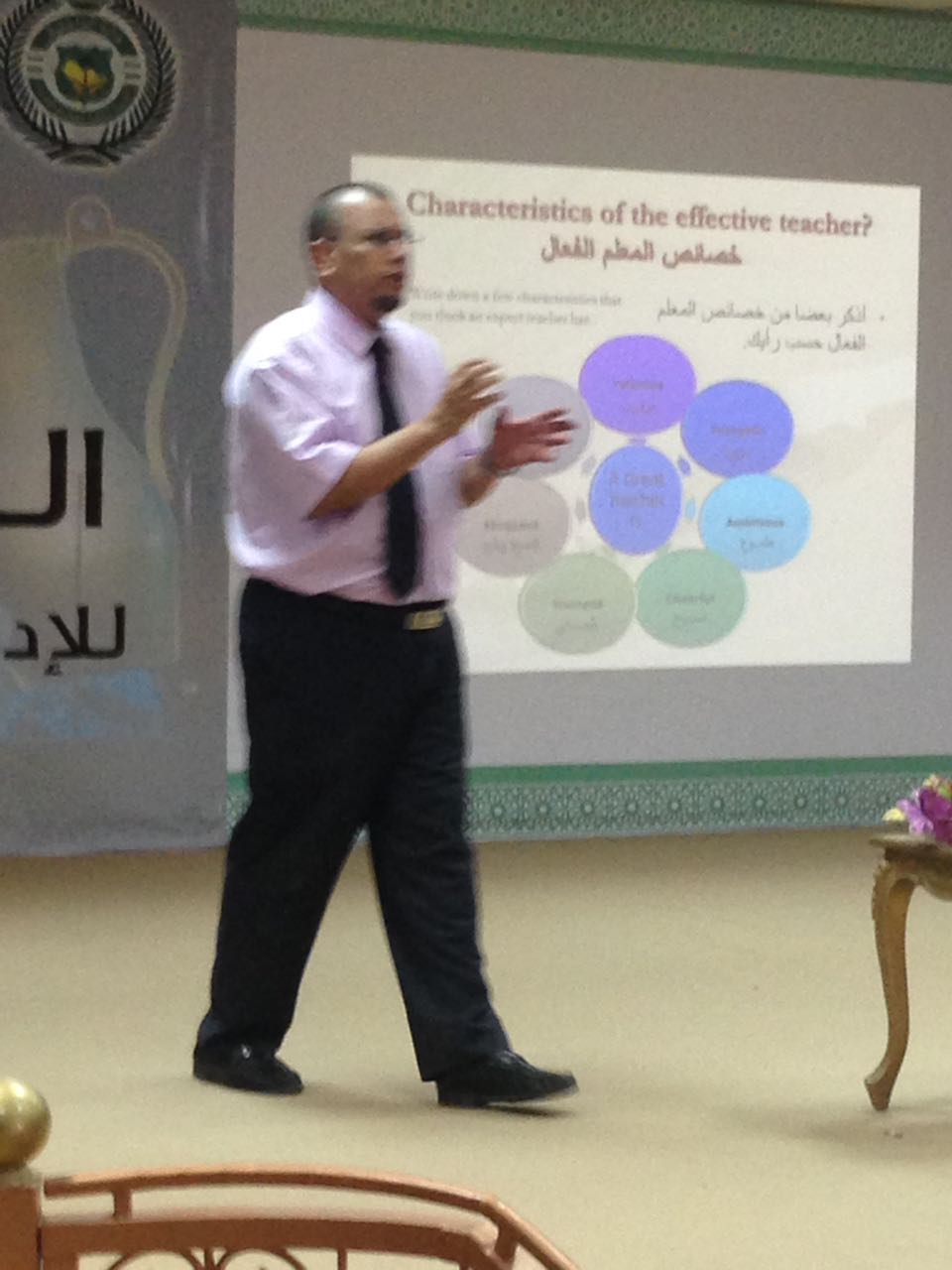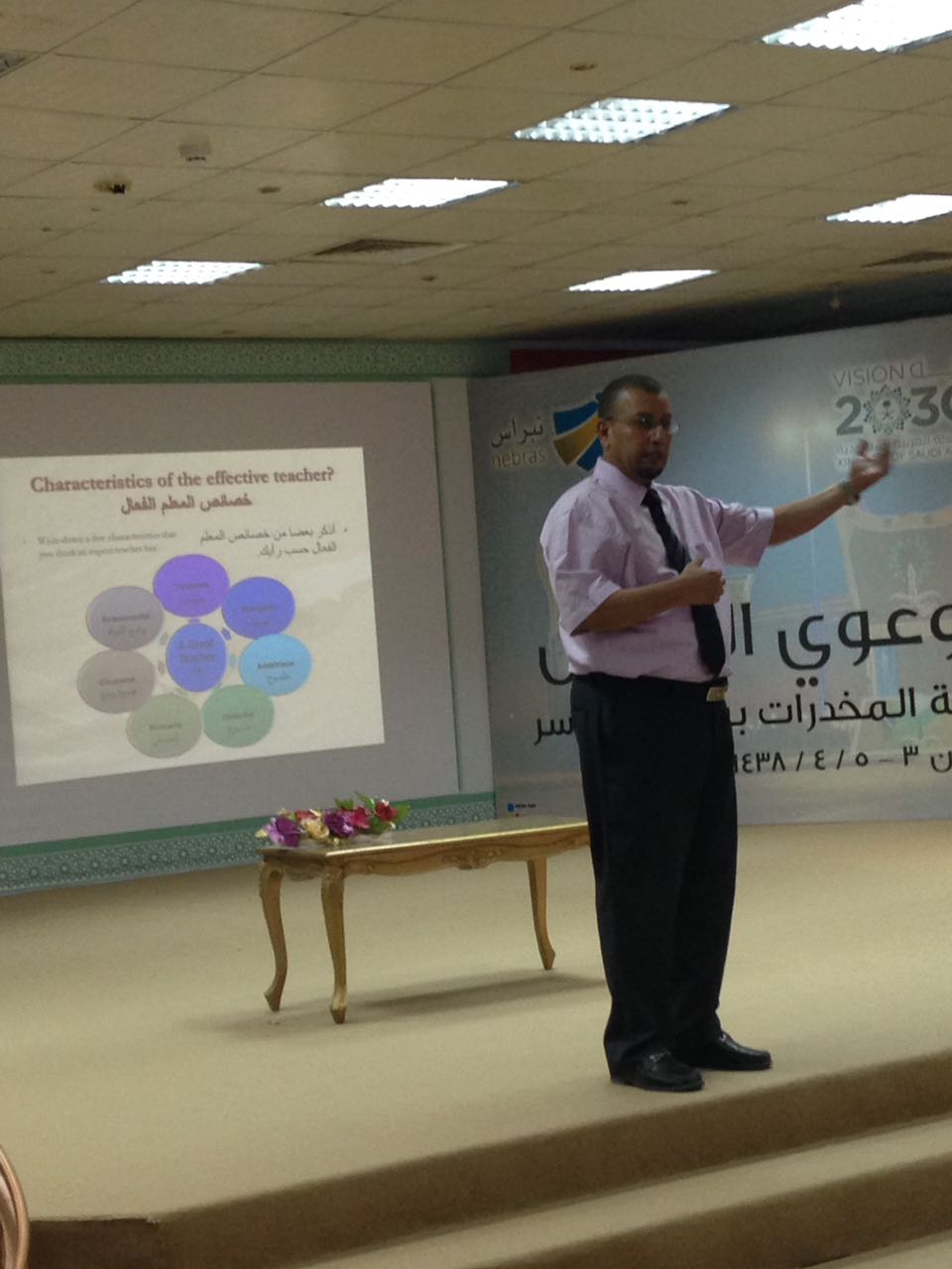 وبين اللموشي ضرروة امتلاك المهارات اللفظية والحركية والفنية اللازمة لتحقيق أداء متميز لإيصال المعلومة للطلاب من خلال المشاركة والحوار بين المعلم والطالب .
