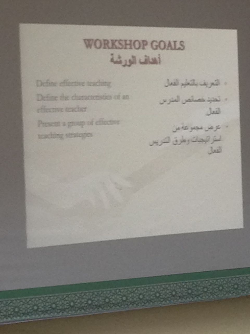 وفي الختام ناقش الحضور من أعضاء هيئة التدريس مفهوم التدريس الفعال ، مواصفات ومهارات المعلم الفعال ونماذج من استراتيجيات التدريس الفعال .