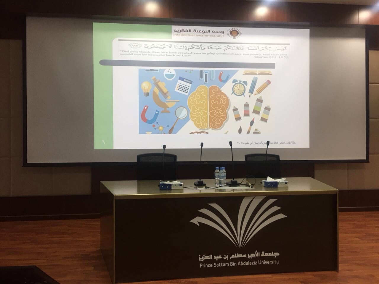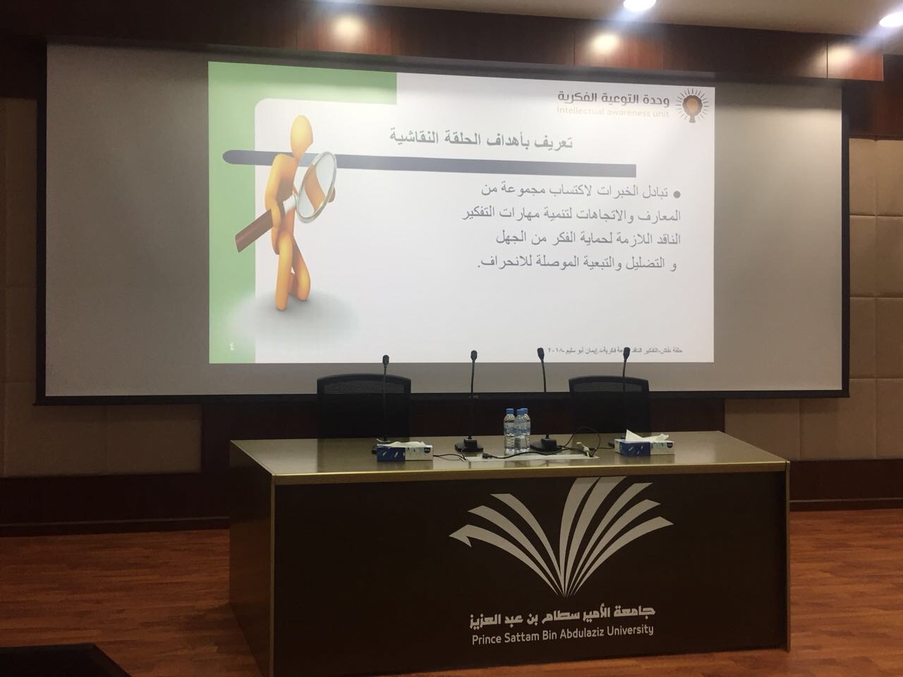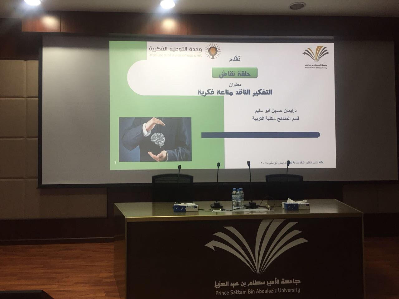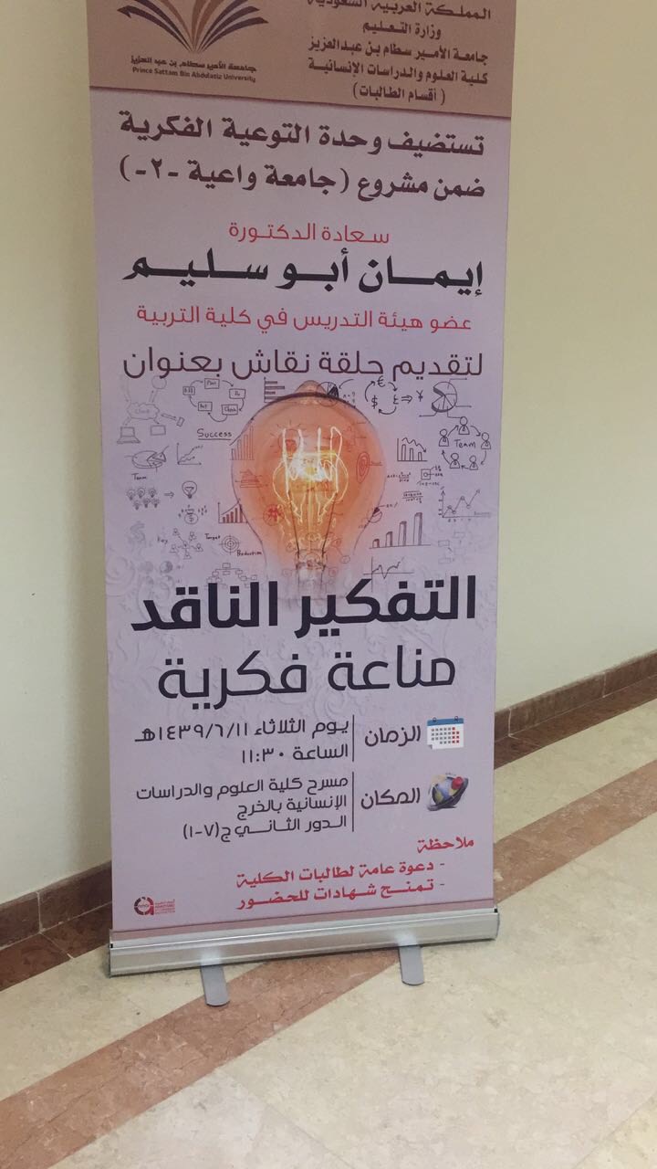 استضافت وحدة التوعية الفكرية بالجامعة يوم الثلاثاء الموافق 11/6/1439 هـ في كلية العلوم والدراسات الإنسانية بالخرج وضمن مشروع (جامعة واعية -2-) سعادة الدكتورة / إيمان أبو سليم عضو هيئة التدريس بكلية التربية بالخرج وذلك لتقديم حلقة نقاش للطالبات بعنوان ( التفكير الناقد مناعة فكرية) في مسرح الكلية في تمام الساعة 11 ونصف.
