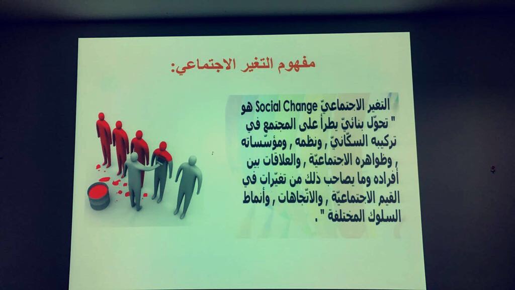 أقام قسم العلوم التربوية بالتعاون مع وحدة العمل الطلابي في يوم الأثنين 23رجب ورشة عمل بعنوان " التغيرات الاجتماعية بالمجتمع السعودي وأثرها على التربية " بدأت من الساعة الثامنة صباحاً لمدة ساعتين ، قدمتها الدكتورة نوال الرشود الأستاذ المساعد بقسم العلوم التربوية بكلية التربية بالخرج هدفت إلى تعريف الطالبة بمفهوم المجتمع وبمفهوم التغير الاجتماعي وأثره على الميدان التربوي ، كما تضمنت الدورة عدة محاور منها : دورة التغير الاجتماعي ، وعلاقة التغير الاجتماعي بالتغير الثقافي . أهم التغيرات الاجتماعية التي حدثت في المجتمع السعودي ، وقد دار حوار ونقاش مع الحاضرات حول أهم الآثار التي تبعت تلك التغيرات الاجتماعية وكانت واضحة في ميدان التربية التعليم . وقد حضر الدورة عدد من الطالبات بالكلية .
