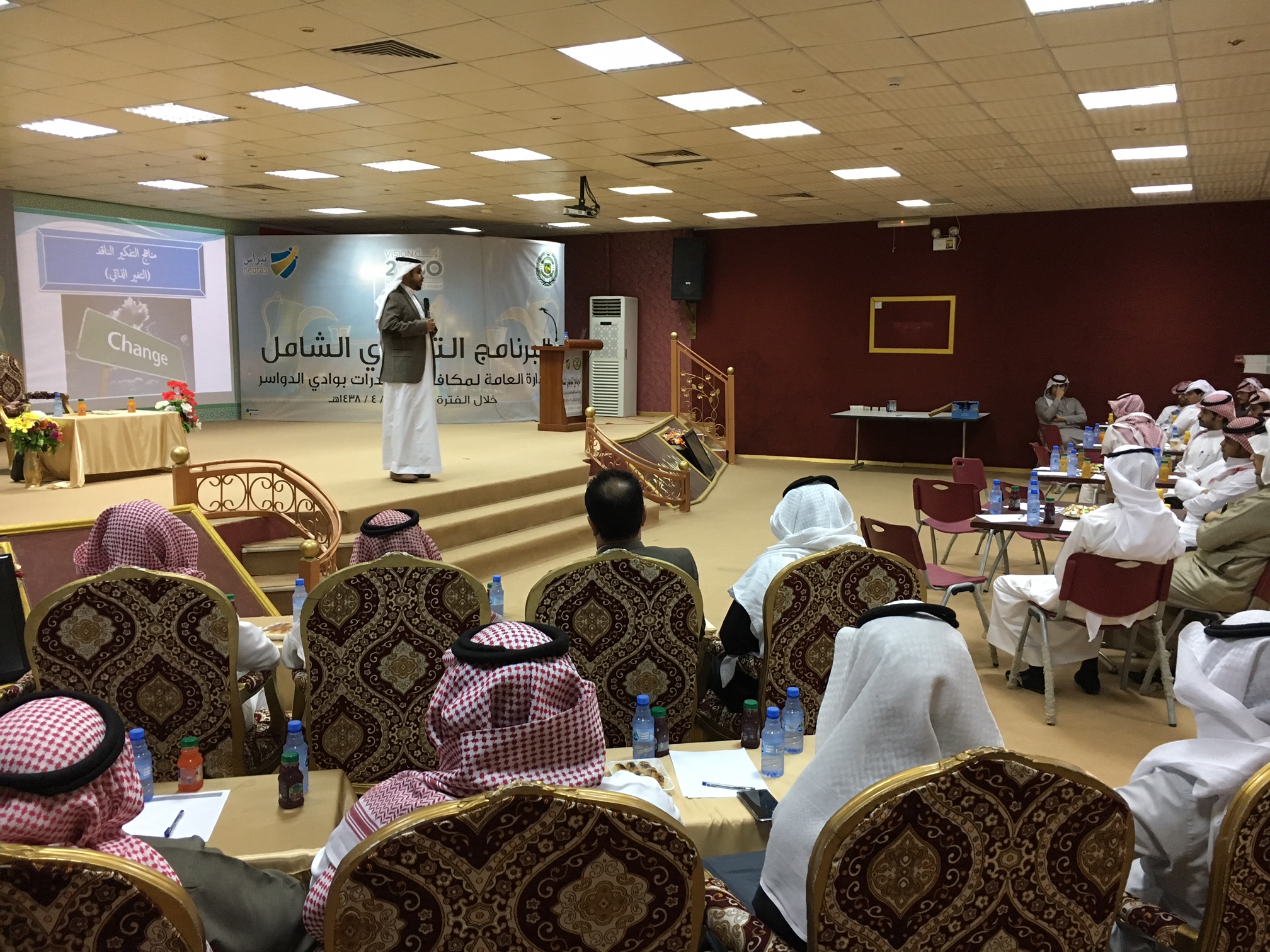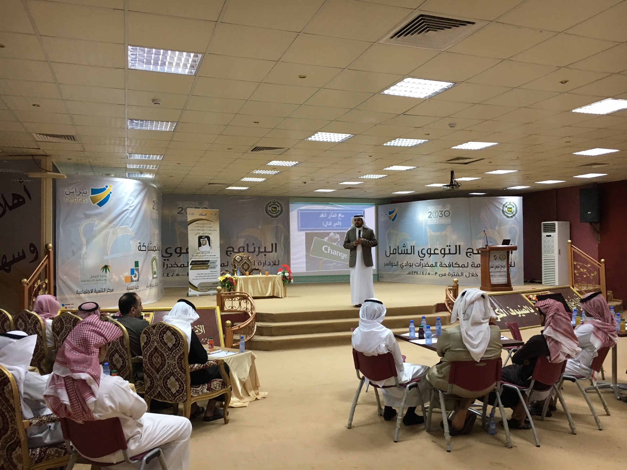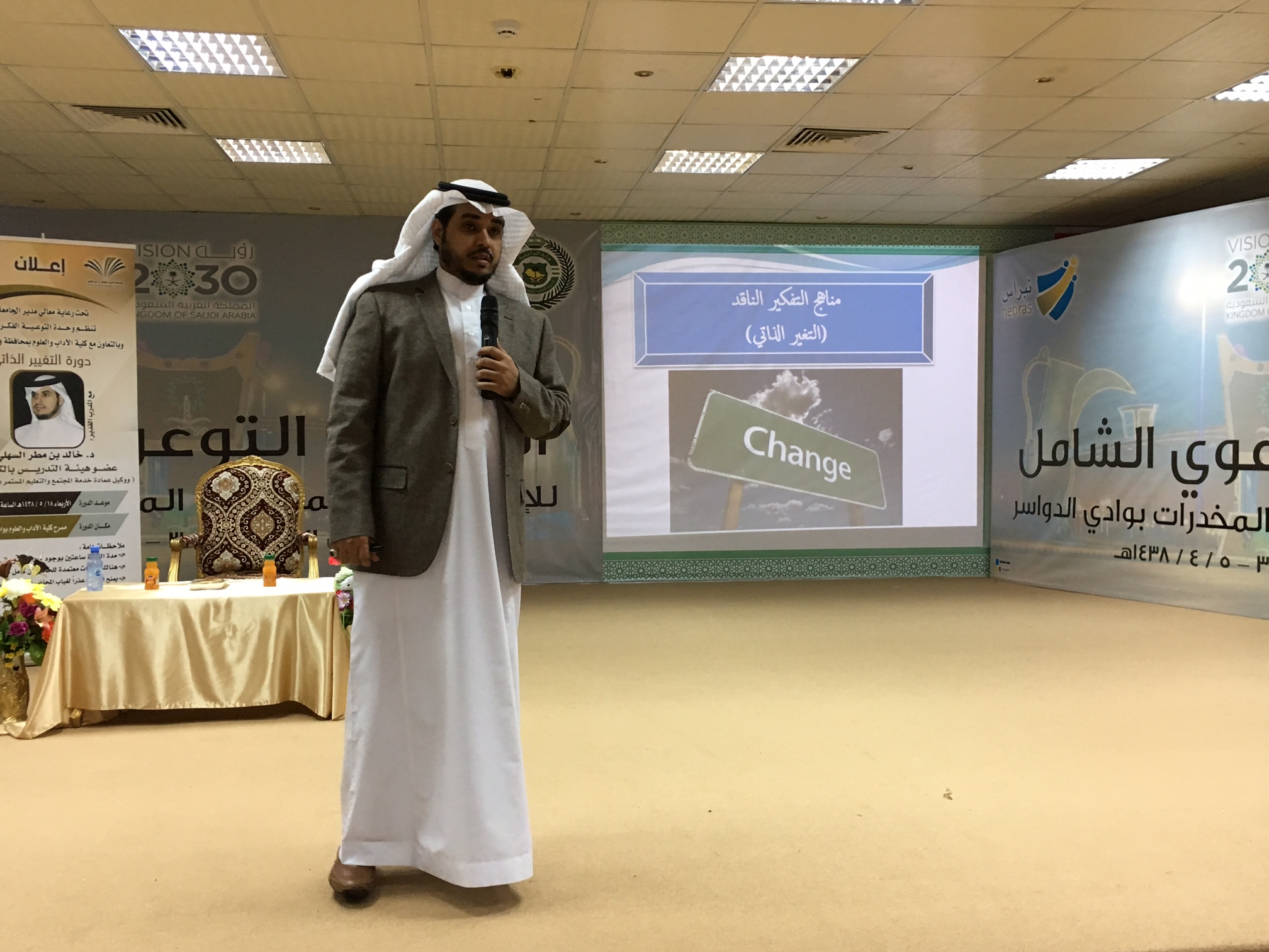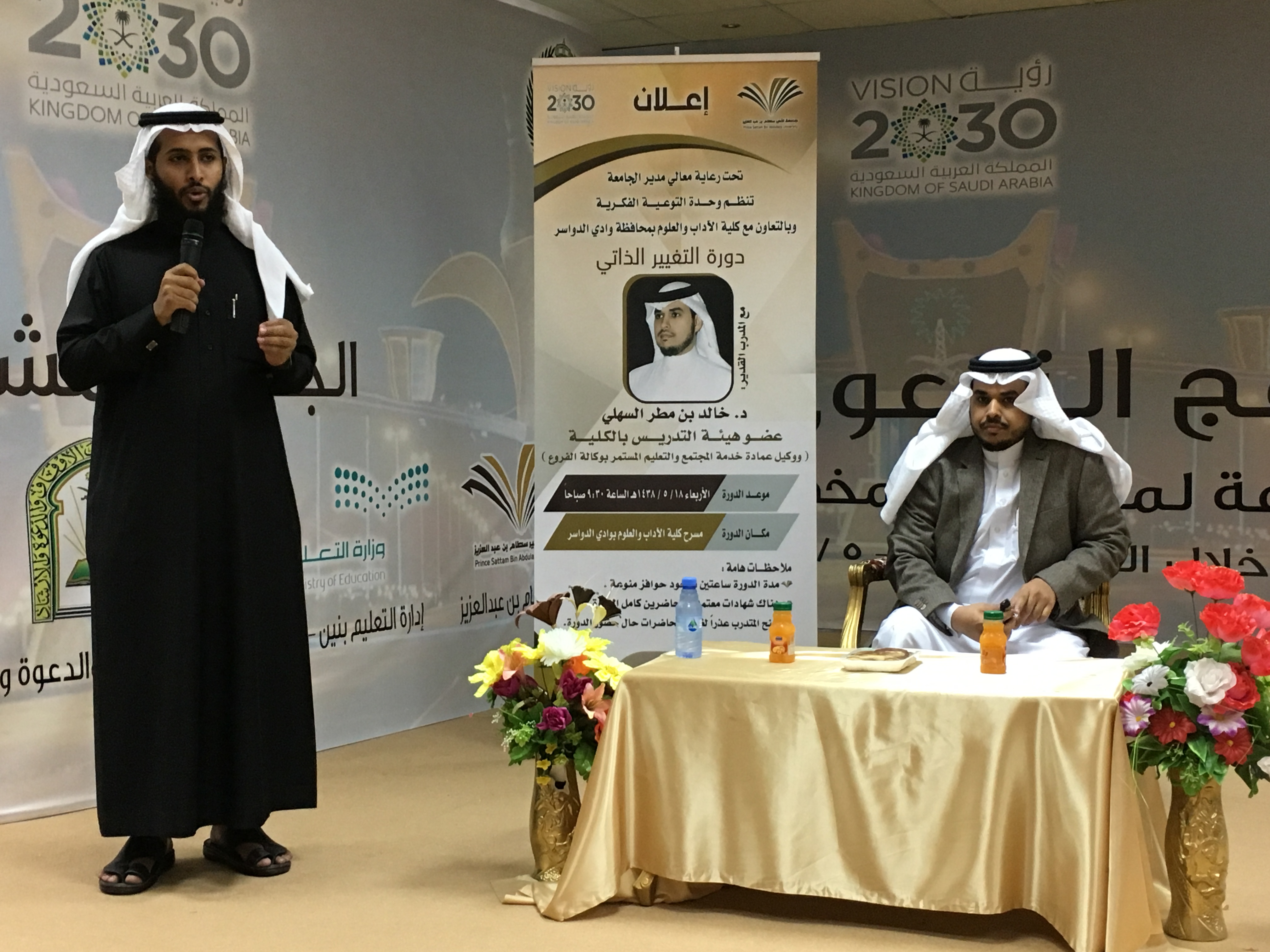 تحت رعاية معالي مدير الجامعة نظمت وحدة التوعية الفكرية بالجامعة بالتعاون مع كلية الآداب والعلوم بمحافظة وادي الدواسر دورة تحت عنوان ( التغيير الذاتي ) قدمها د. خالد بن مطر السهلي وكيل عمادة خدمة المجتمع والتعليم المستمر بوكالة الفروع ، وذلك من منطلق الاهتمام بمجال تطوير الذات , وتضمنت الدورة التي هدفت الى تعريف المشاركين بمفهوم التغيير الذاتي و أهميته , وركائزه و مجالات التغيير الذاتي ، وأوضح السهلي انه لكي تتغير ذاتياً و تعدل من حالك تحتاج المرور إلى أربعة مراحل وهي : الرغبة في التغيير وأنها تأتي من داخلك أنت شخصياً ، اتخاذ القرار ، تعلم كيفية التغيير و ذلك بتعلم مناهج التنمية البشرية و موضوعات التطوير الذاتي ، ثم أخيرا التطبيق .