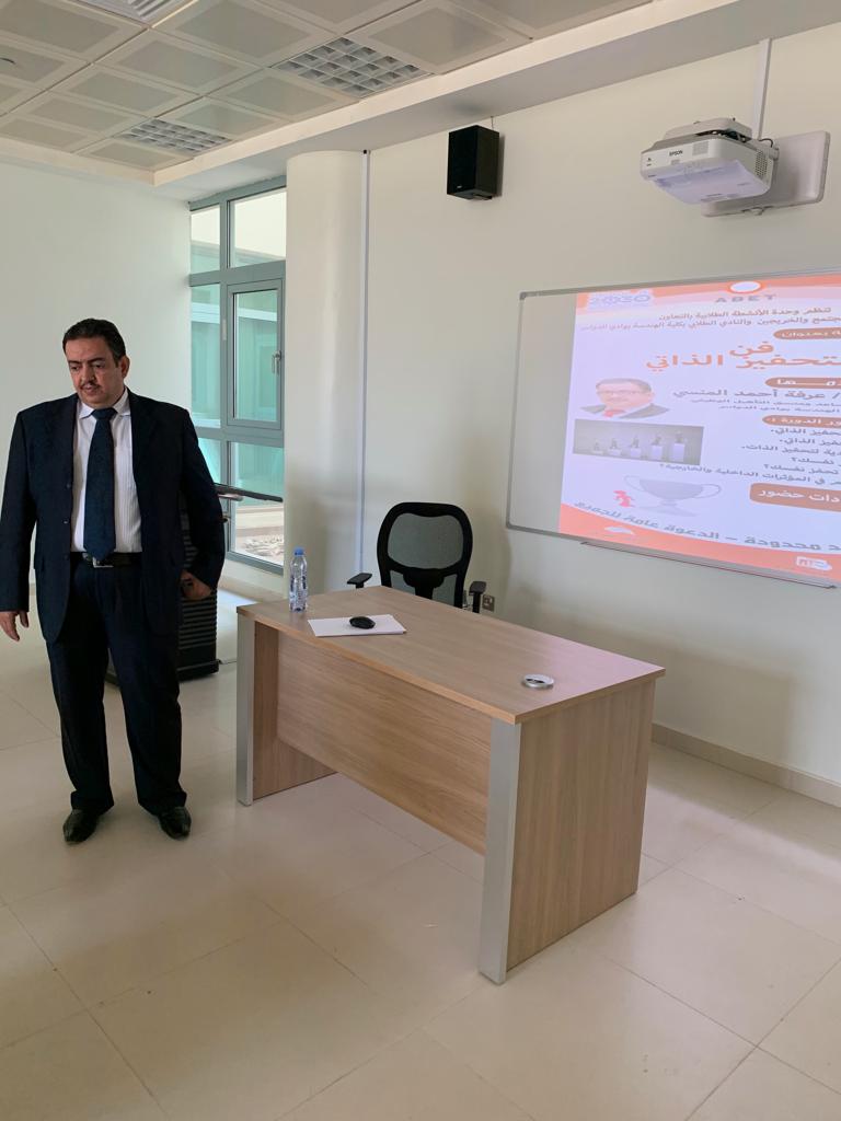 اختتم 25 طالباً يوم أمس الثلاثاء الموافق1441/2/9هـ دورة تدريبية بعنوان _ فن التحفيز الذاتي _ والتي نفذها الدكتور/ عرفة احمد المنسي , الأستاذ المساعد ومنسق التأهيل الوظيفي بكلية الهندسة بوادي الدواسر بمقر قاعة التدريب بكلية الهندسة بوادي الدواسر ممثلة بوحدة الأنشطة الطلابية بالتعاون مع وحدة خدمة المجتمع والخريجين والنادي الطلابي ضمن أنشطة كلية الهندسة الإرشادية التي تقيمها من أجل مساعدة الطلاب على حل مشكلاتهم الدراسية ، وتحفيزهم على عدم اليأس ، والتفكير بإيجابية ، والعمل على التفوق والنجاح الدراسي .