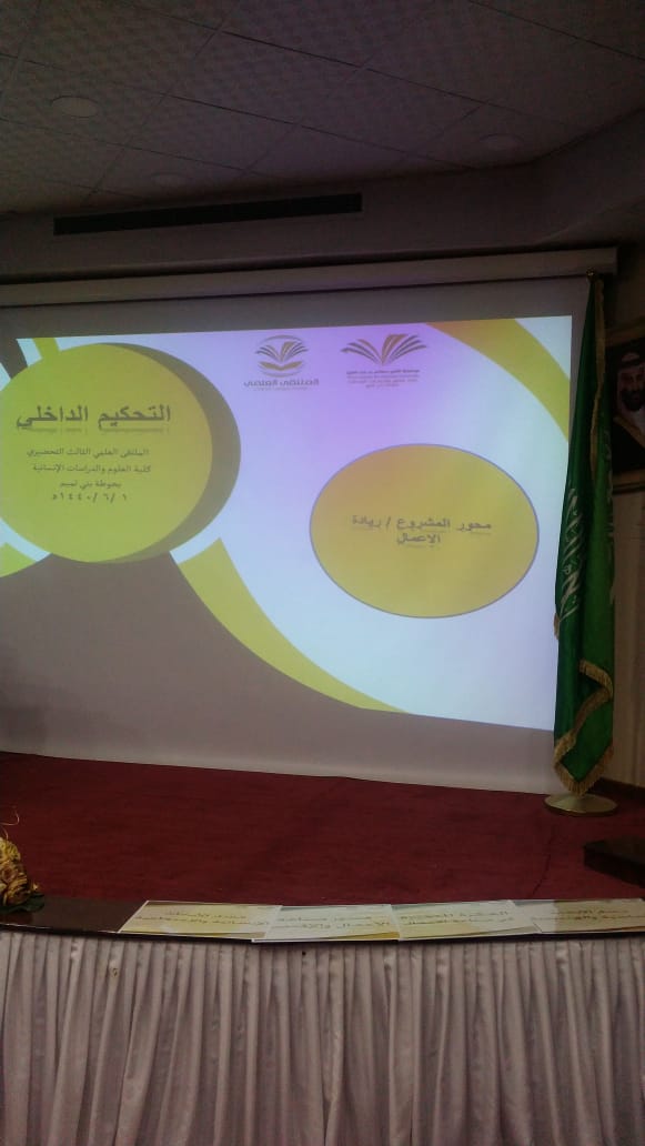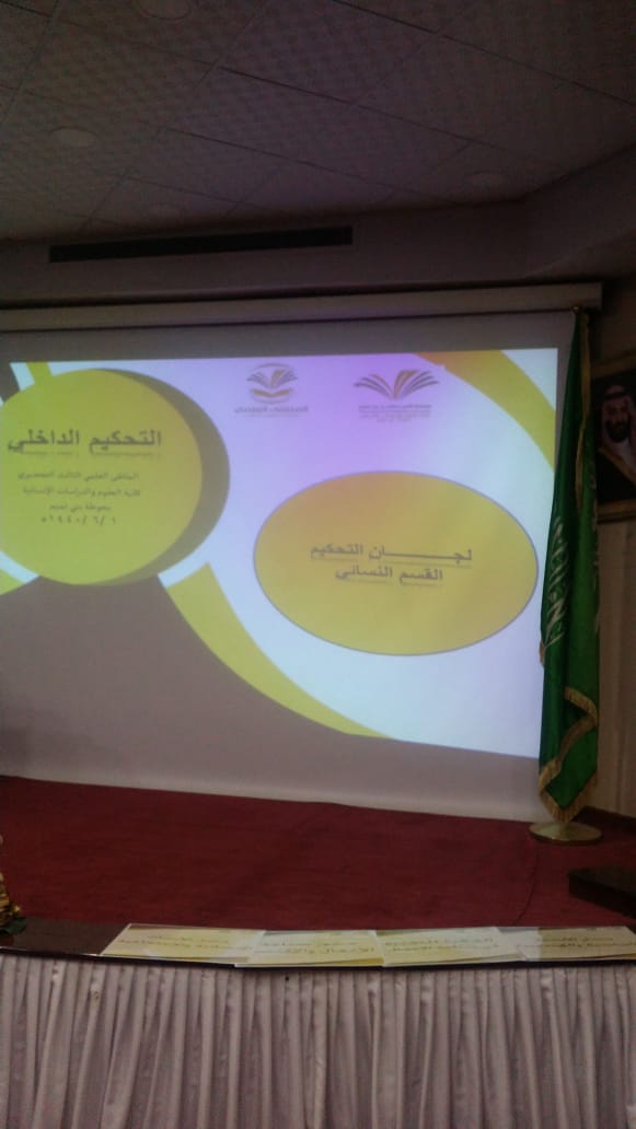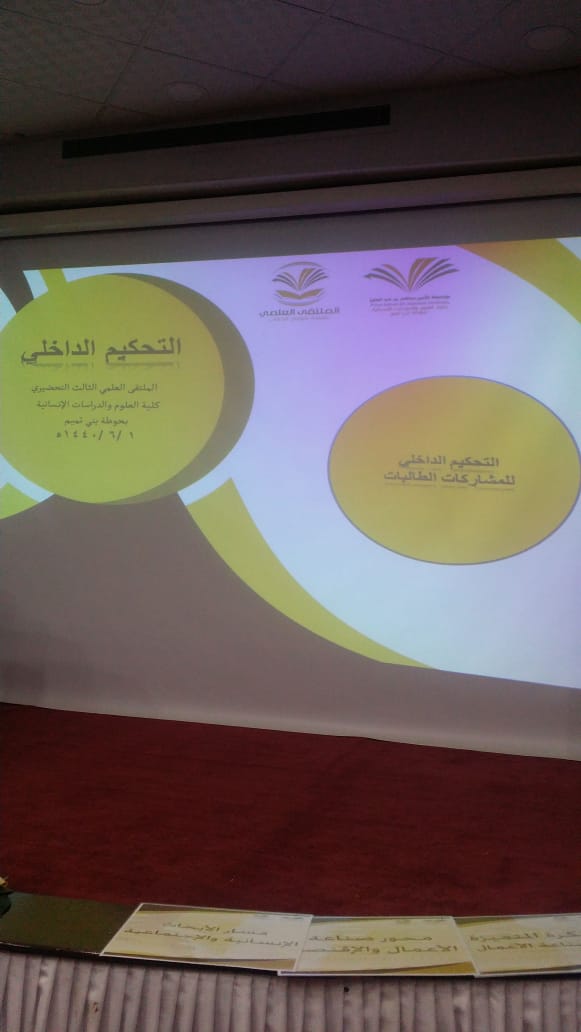 ضمن استعدادات التحضيرية للملتقى العلمي الثالث بكلية العلوم والدراسات الانسانية بحوطة بني تميم، نظمت لجنة الملتقى العلمي يوم الأربعاء الموافق 1/ 6/ 1440 هـ برعاية عميدة الكلية الدكتورة حصة الهزاني وإشراف اللجنة التنظيمية فعالية التحكيم الداخلي للمشاركات. تكونت اللجنة التحكيمية من عضوات واعضاء كلية العلوم وكلية إدارة الأعمال حيث تم تحكيم مشاركات الطالبات التي تم ترشيحها من داخل الكلية. حيت بدأت الفعالية بكلمة ترحيبية من قبل المنسقة العامة الأستاذة اسلام العمري وعرض المحاور التي تمت المشاركة بها ومن ثم تقديم اللجنة الخاصة بكل محور. تلاها البدء بتقديم الطالبات لعروضهن على خشبة المسرح في كل محور من محاور الملتقى حيث كما قامت اللجنة بمناقشة الطالبات وتسجيل الملاحظات على نماذج معايير تحكيم خاصة للمحاور والعروض. وفي الختام تم شكر اللجان والطالبات على ما بذلن من جهود مثمرة ومميزة.