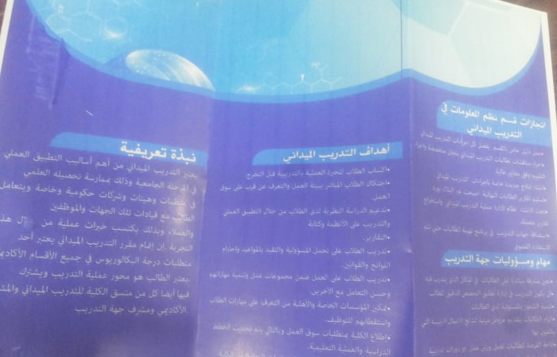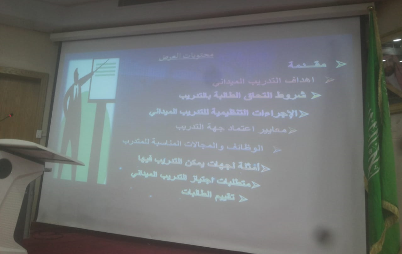 بغرض التعريف بالتدريب الميداني وبيان الإجراءات التنظيمية وكيفية تقييم الطالبات، أقيمت ورشة عمل (التهيئة للتدريب الميداني) بكلية العلوم والدراسات الإنسانية بحوطة بني تميم يوم الاربعاء الموافق 24/ 5/ 1440 هـ من إعداد وتقديم أ.وفاء حمزة فضل مضوي منسقة التدريب الميداني بقسم نظم المعلومات عند الساعة التاسعة والنصف صباحاً بمسرح الكلية. حيث أقيمت الورشة تحت رعاية عميدة الكلية الدكتورة حصة بنت سعود الهزاني، وبحضور ممثلين جهات خارجية ومنسقات تدريب في الأقسام الأخرى وعدد 33 طالبة ولمدة ساعة ونصف. في بداية برنامج الورشة تم توزيع مطويات للطالبات تبين المهام الخاصة بالطالبة في جهة التدريب والمهام الخاصة بمشرف التدريب في الجهة والمهام الخاصة بالمشرف الأكاديمي بالكلية. ثم بعد ذلك عرضت أ.وفاء حمزة على الحضور أهداف التدريب ومميزاته وكيفية التسجيل في التدريب الميداني والإجراءات التنظيمية للتدريب وكيفية تقييم الطالبات في نهاية فترة التدريب. ومن ثم جاءت كلمة ضيوف التهيئة وهم ممثلين جهات التدريب خارج الكلية حيث شاركت الدكتورة زكية العجلان ممثلة ادارة التعليم بكلمتها التي تحدثت فيها عن تضافر الجهود لتحقيق الهدف الأساسي وهي استفادة الطالبات وكيفية تأدية المهام بصورة مرضية مما كان لها الأثر الكبير في تهيئة الطالبات بعد ذلك تم فتح المجال للطالبات للاستفسارات.
