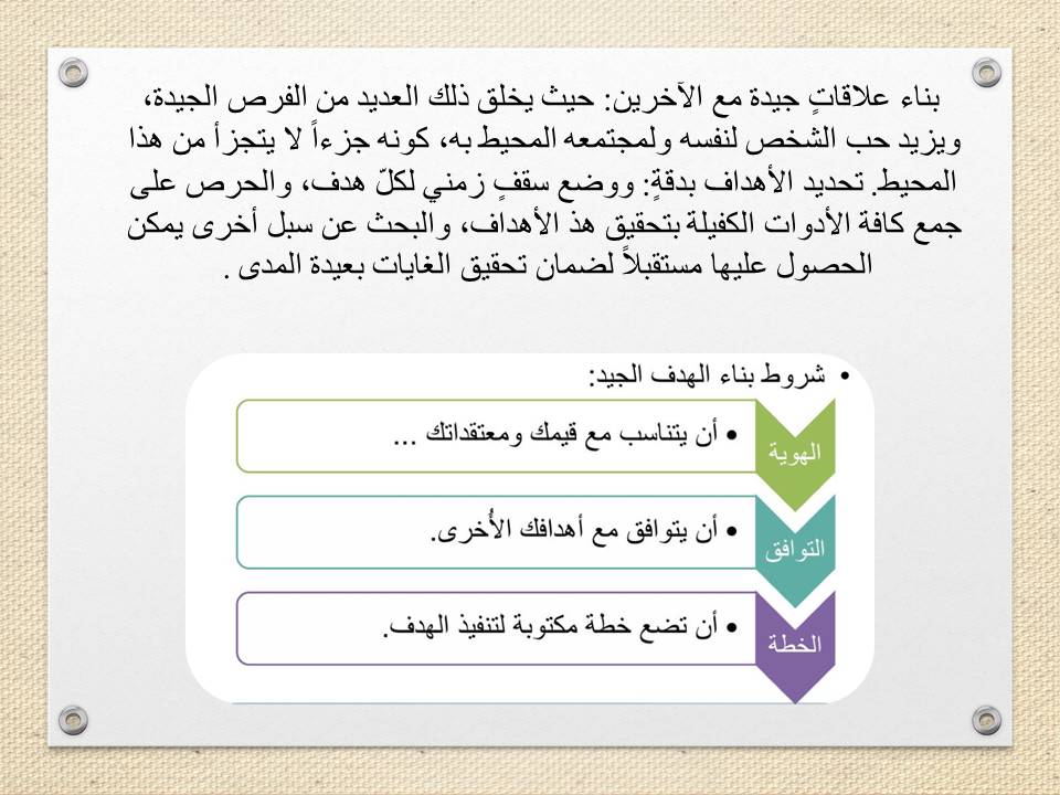 كما وضحت الدورة للطالبات أهمية التفكير الإيجابي والقدرة على تحقيق الأهداف لكي تنعم بمستقبل باهر وتحقيق مكانةٍ اجتماعيةٍ مناسبةٍ ، و بالنهاية شارك الحضور في مناقشة تفاعلية و لاقت الدورة تفاعلا مثمراً.