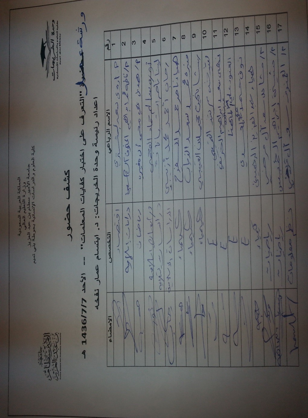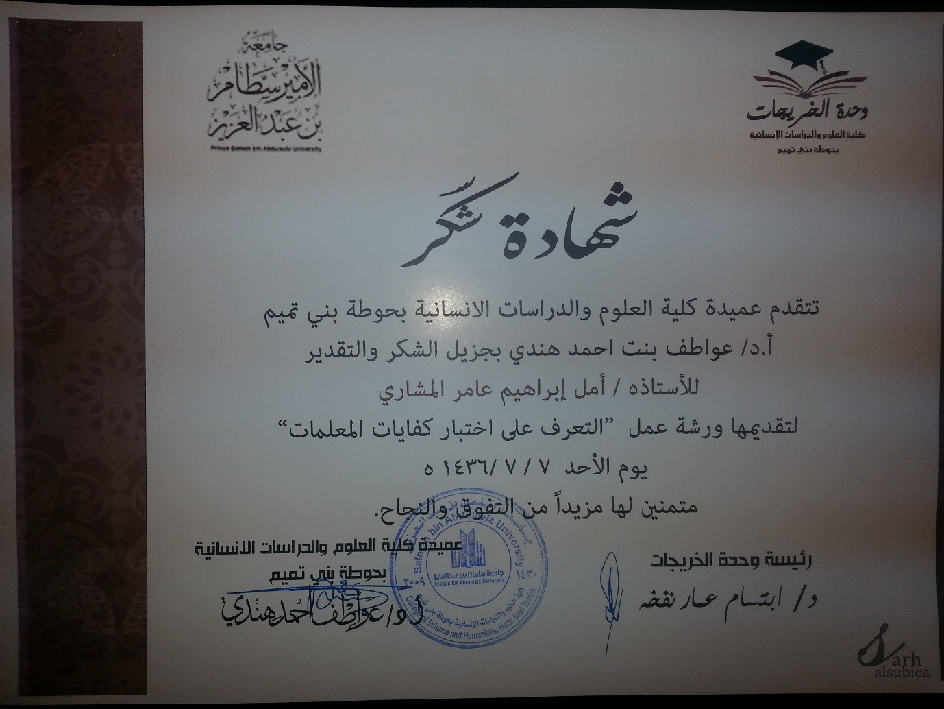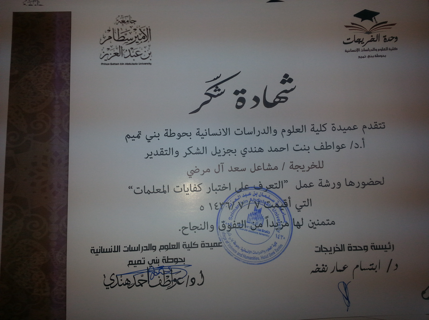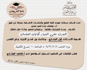 نظمت وحدة الخريجات بكلية العلوم والدراسات الإنسانية بحوطة بني تميم ورشة عمل بعنوان ( التعرف على اختباركفايات المعلمات) بإشراف رئيسة وحدة الخريجات د. ابتسام عمار نفخه. قدمت الأستاذة أمل المشاري عرض شامل عن اختبار كفايات المعلمات. حيث شرحت بإيجاز هدف الاختبار،ومحتواه, وطبيعته، وزمنه. تخللت الورشة مداخلات للحاضرات بإلقاء عدة أسئلة تتمحور حول الإعداد للاختبار . وفي الختام قامت وكيلة الكلية ورئيسة الوحدة بتقديم شهادات شكر للمشاركات في الورشة مصحوبة بسي دي يحتوي على دليل الاختبارات في جميع التخصصات.