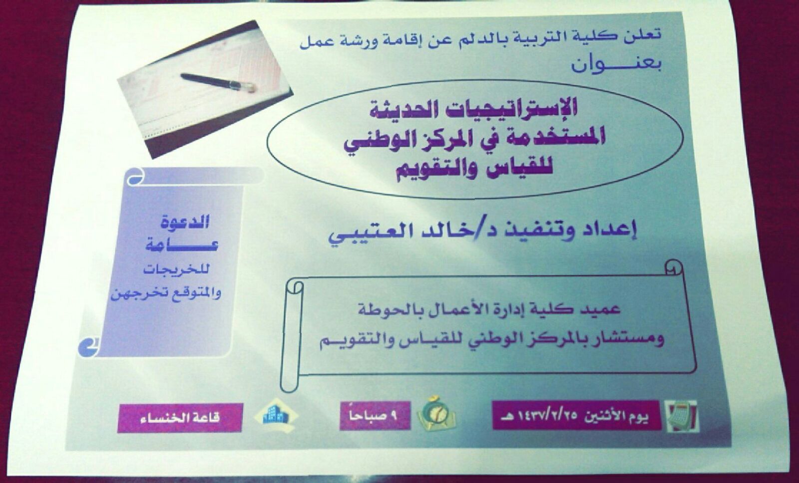 تحت رعاية عميدة كلية التربية بالدلم الدكتورة/ حنان مانع الجهني نظمت وحدة الخريجات وبالتعاون مع كلية إدارة الأعمال بالحوطة ورشة عمل بعنوان " اختبار كفايات المعلمات " من إعداد وتنفيذ د/ خالد العتيبي- عميد كلية إدارة الأعمال والمستشار بالمركز الوطني للقياس والتقويم، وذلك يوم الاثنين الموافق 1437/2/25هـ الساعة التاسعة صباحاً بقاعة الشبكة