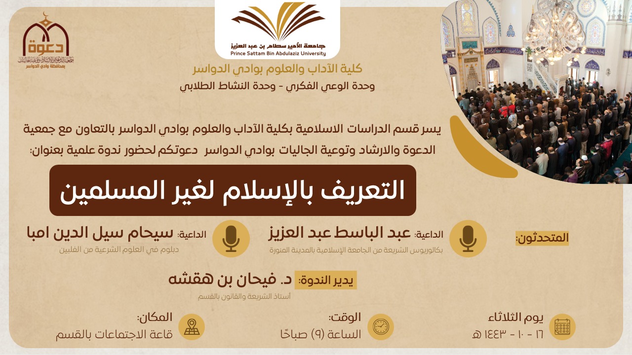 نظم قسم الدراسات الإسلامية بكلية الآداب والعلوم التابعة لجامعة الأمير سطام بن عبدالعزيز بوادي الدواسر، وبالتعاون مع جمعية الدعوة والإرشاد وتوعية الجاليات بالمحافظة، ندوة بعنوان " التعريف بالإسلام لغير المسلمين" قدمها الداعية عبدالباسط عبدالعزيز والداعية سيحام سيل الدين امبا وادار الندوة الدكتور فيحان بن هقشة.