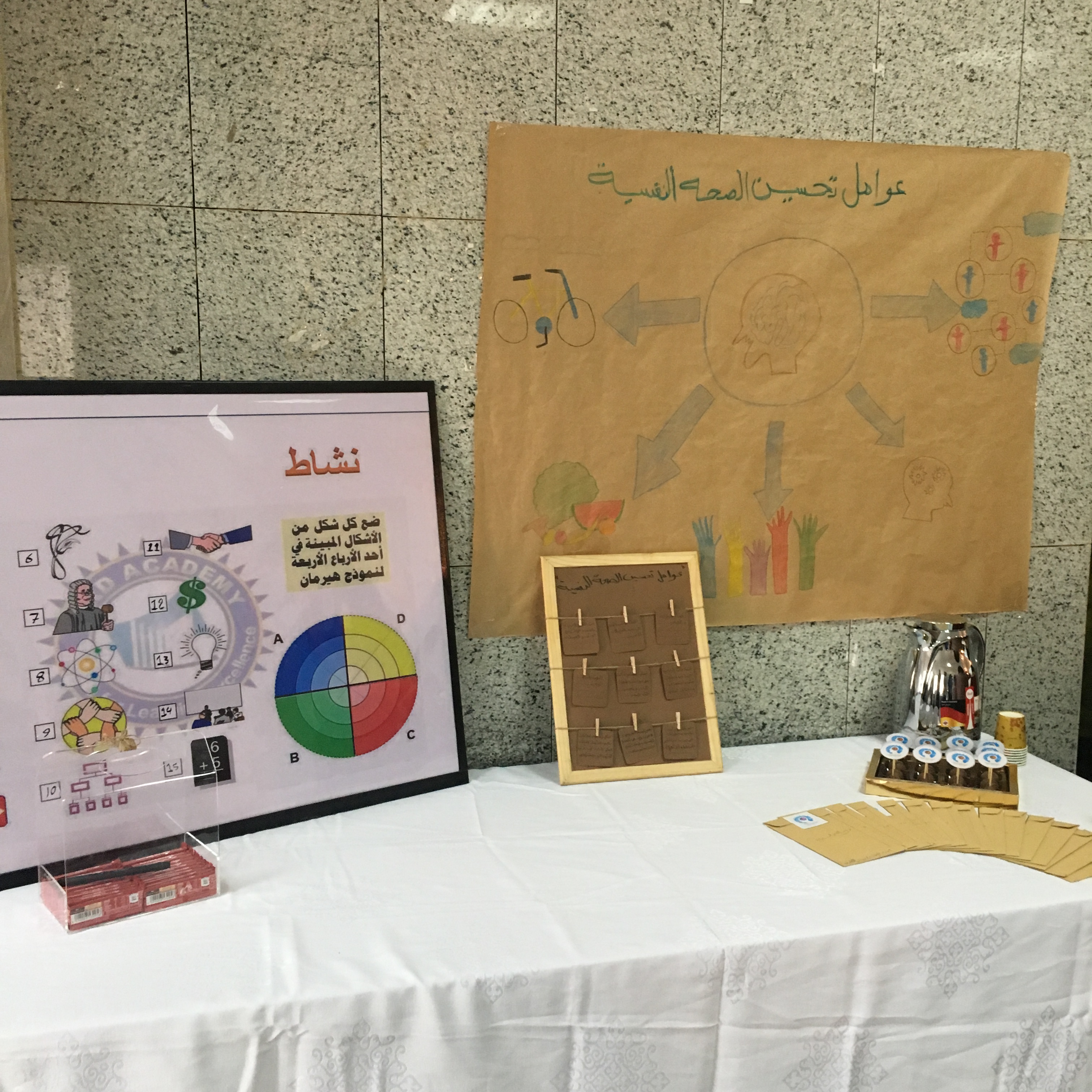 أقام قسم علم النفس يوم الأربعاء 20 /3 / 1439هـ فعالية: (التعريف بالصحة النفسية) تحت إشراف أ.أمل السويلم .وتعرف الصحة النفسية أو الصحة العقلية بأنها مستوى الرفاهية النفسية أو العقل الخالي من الاضطرابات، وهي الحالة النفسية للشخص الذي يتمتع بمستوى عاطفي وسلوكي جيد من وجهة نظر علم النفس الإيجابي أو النظرة الكلية للصحة العقلية من الممكن أن تتضمن قدرة الفرد على الاستمتاع بالحياة وخلق التوازن بين أنشطة الحياة ومتطلباتها لتحقيق المرونة النفسية، وتهدف الفعالية لعرض نماذج من الحياة يعيشون أفضل مراحل الصحة النفسية، والكشف عن بعض طرق الوقاية من الأمراض النفسية والتعرف على أنواع الفنيات التي قد تساعد من رفع مستويات الصحة النفسية.