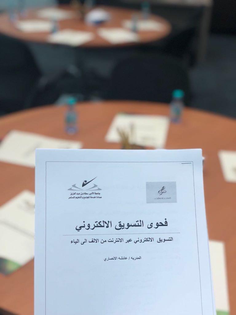 نظَمت عمادة خدمة المجتمع والتعليم المستمر بالتعاون مع مكتب وحدة الخريجات بكلية التربية بالدلم صباح اليوم دورة تدريبية بعنوان : التسويق الإلكتروني عبر الانترنت من الألف إلى الياء قدمتها المدربة: عائشة الانصاري وذلك في مقر كلية التربية بالدلم استهدفت فيها خريجات الجامعة والمهتمات بالتسويق والتجارة الالكترونية شارك فيها (19) متدربة