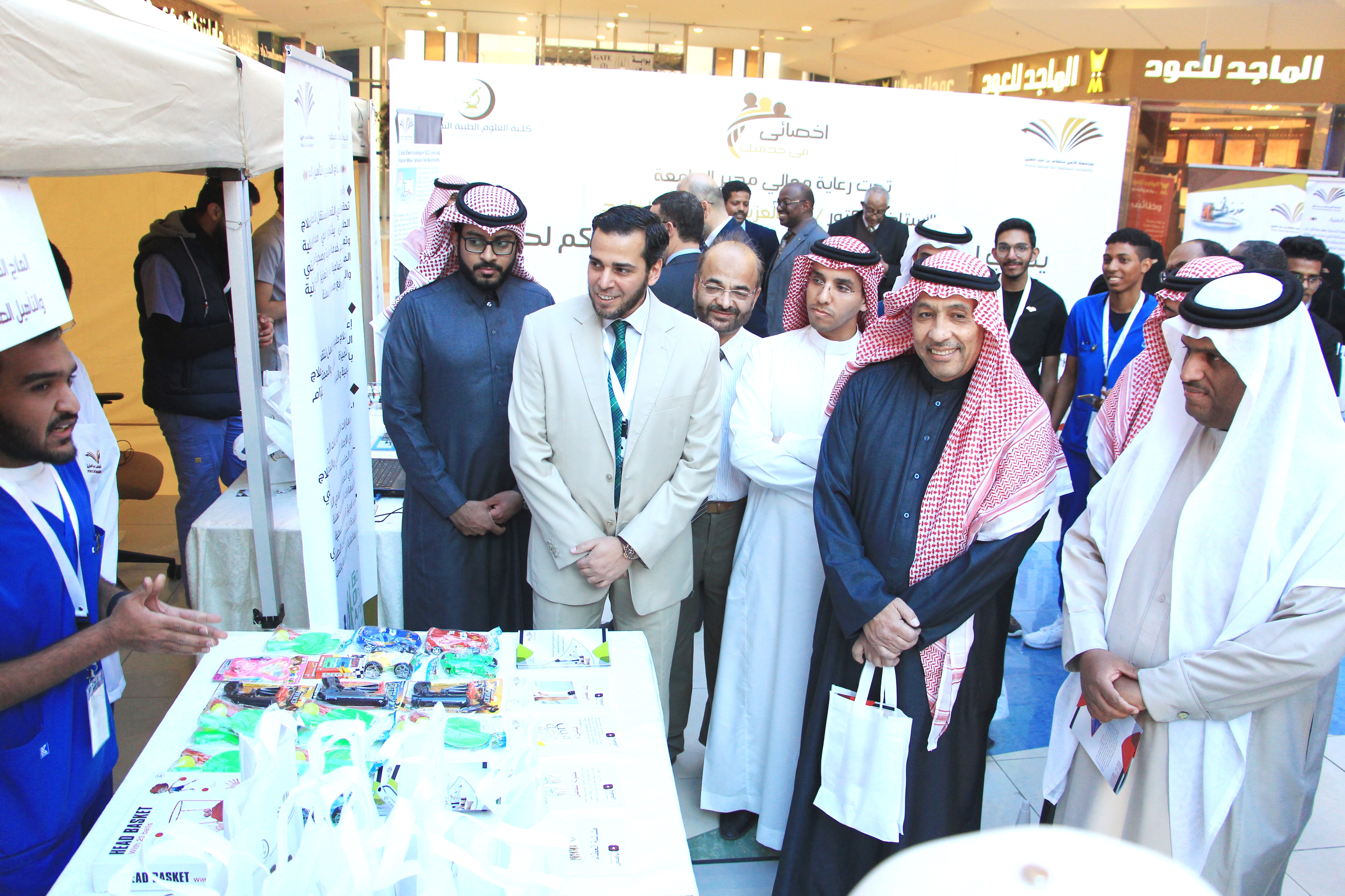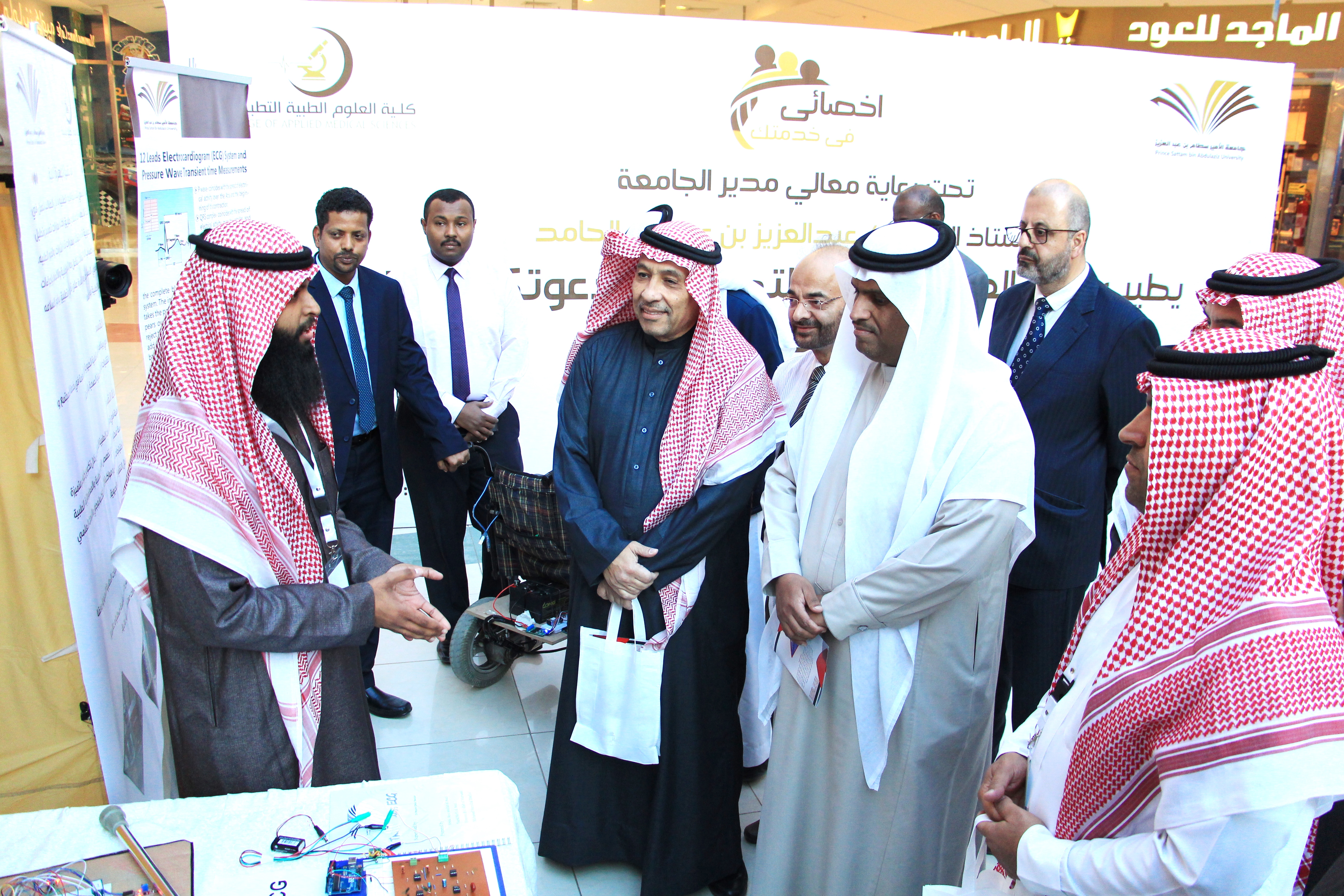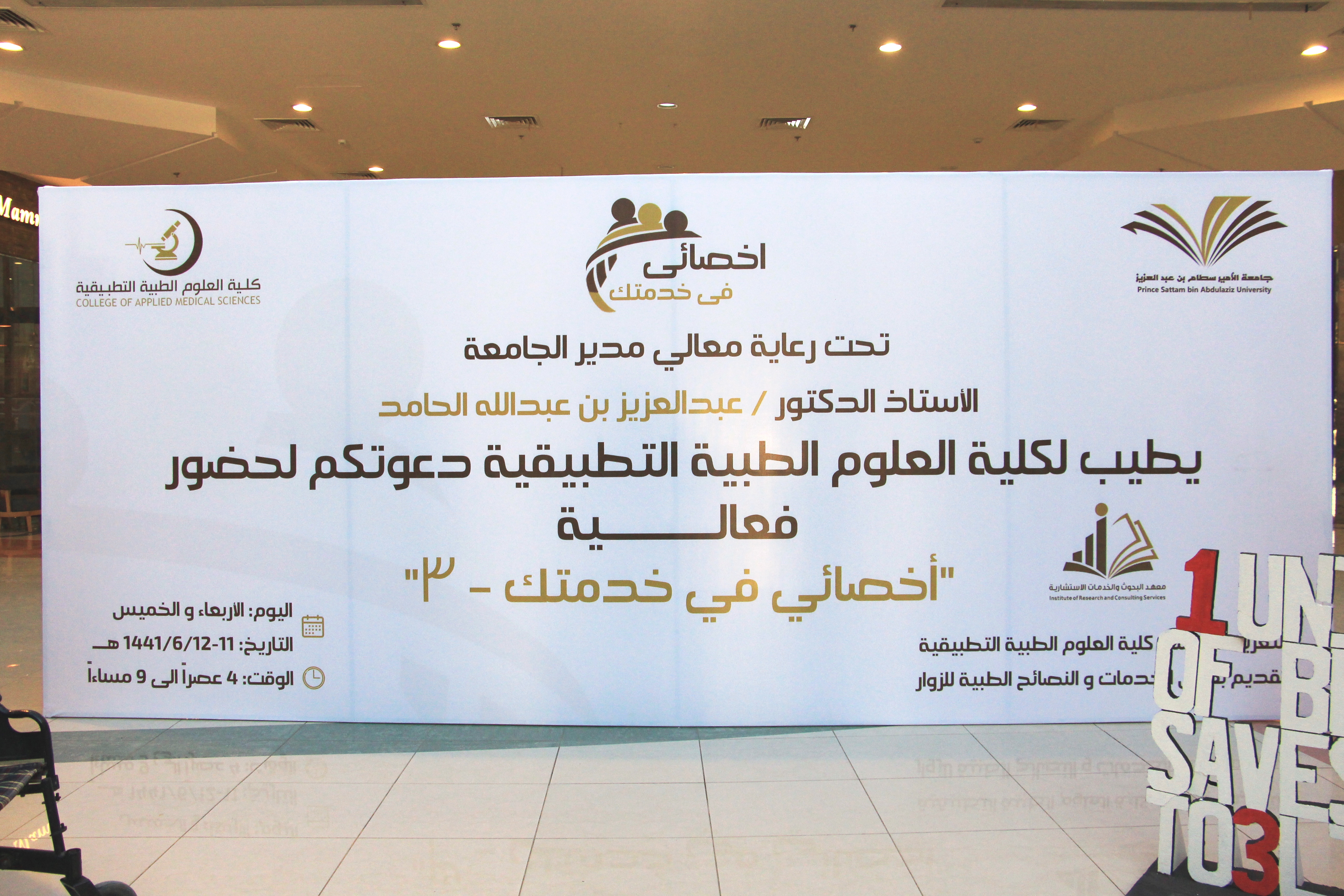 تحت رعاية معالي مدير الجامعة الأستاذ الدكتور / عبدالعزيز بن عبدالله الحامد أقامت كلية العلوم الطبية التطبيقية ممثلة في وحدة خدمة المجتمع فعالية " أخصائي في خدمتك في نسختة الثالثة يوم الأربعاء و الخميس الموافق 11-12-/1441/6هـــ في بهو الحديثي مول بالخرج، بالنيابة عن معالي مدير الجامعة دشن سعادة وكيل الجامعة للشؤون التعليمية و الأكاديمية سعادة الدكتور / مشاري بن عياد العصيمي وكان في استقباله عميد كلية العلوم الطبية التطبيقية سعادة الأستاذ الدكتور / ماهر بن مفضي العنزي و وكلاء الكلية سعادة الدكتور / سعود الرويلي و سعادة الدكتور / سعود السبيعي و لفيف من أعضاء هيئة التدريس و الموظفين في الكلية، بدأت الفعالية بقص شريط الافتتاح و من ثم اصطحب عميد الكلية و سعادة الدكتور / محمد السعدي مشرف وحدة خدمة المجتمع و الضيوف وكيل الجامعة في جولة ميدانية على أقسام الفعالية حيث استمع سعادته لشرح توضيحي من قبل أعضاء هيئة التدريس و الطلاب والطالبات ما يقدمه القسم الأكاديمي في خدمة المجتمع و ما يساهم به من خدمات طبية و ارشادية للمجتمع بشطريه الرجالي و النسائي.