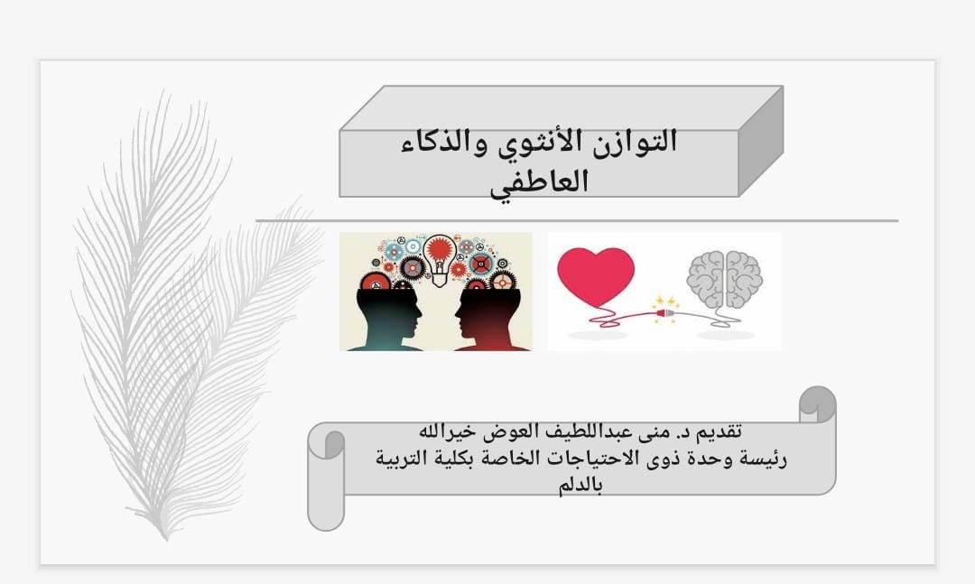 ثم ابتدأت الدكتورة منى الحديث حول أساس التوازن الأنثوي وأوضحت انه هو الذكاء العاطفي وتحدثت عن أنواعه ونشأته وأبعاده وهي معرفة العواطف للفرد وإدارتها والتحفيز النفسي وملاحظة عواطف الأخرين.