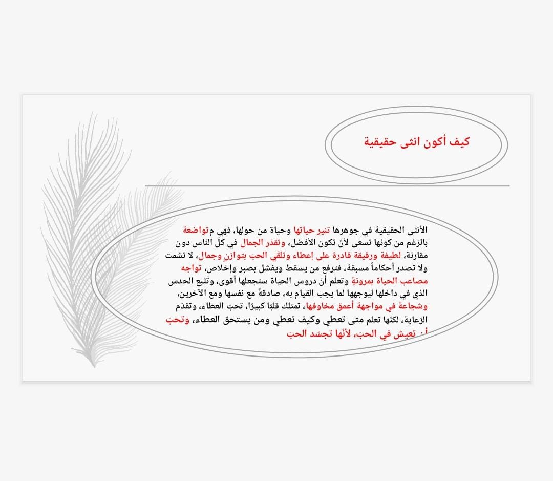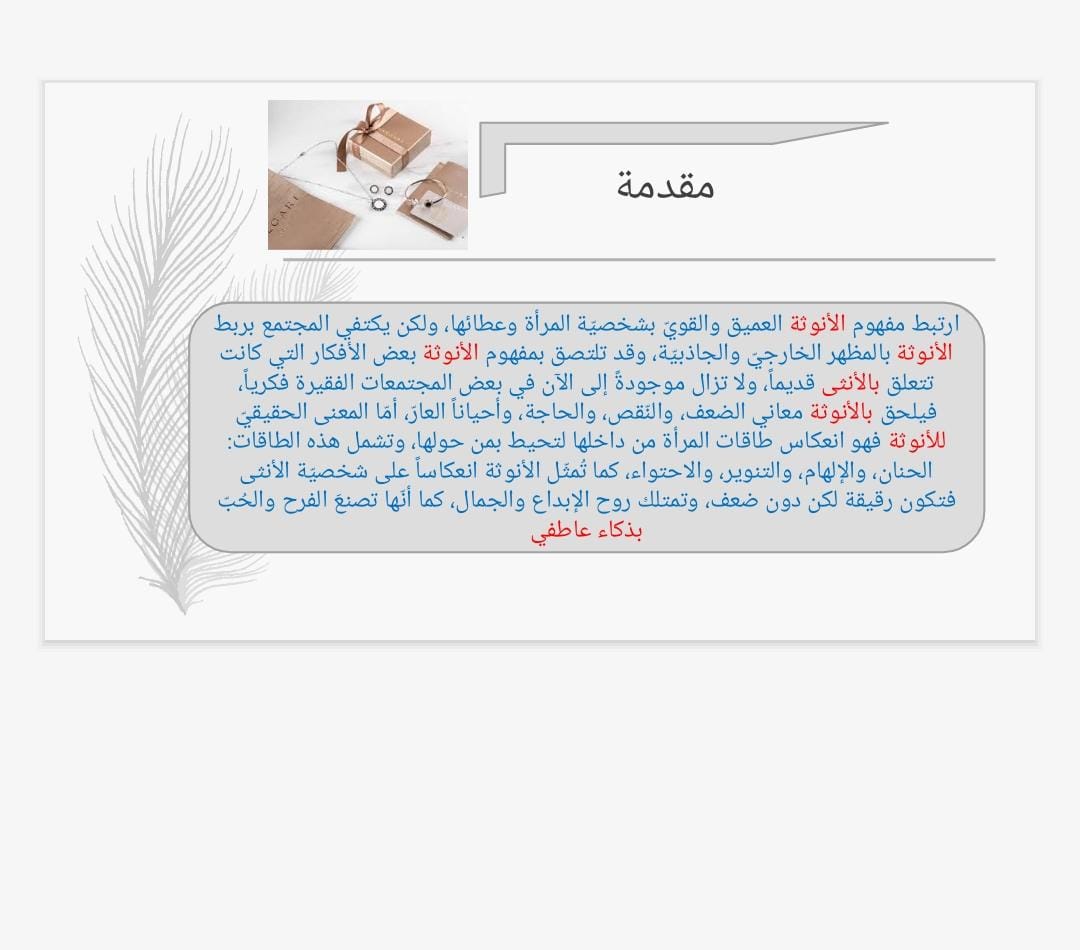 ثم انتقلت الى مفهوم الأنوثة وارتباطه بشخصية المرأة وعطائها واساسيات غرس الأنوثة وكيفية التحسين من الذكاء العاطفي للأنثى وكيف تكتسب الأنثى فن الذكاء الأنثوي.