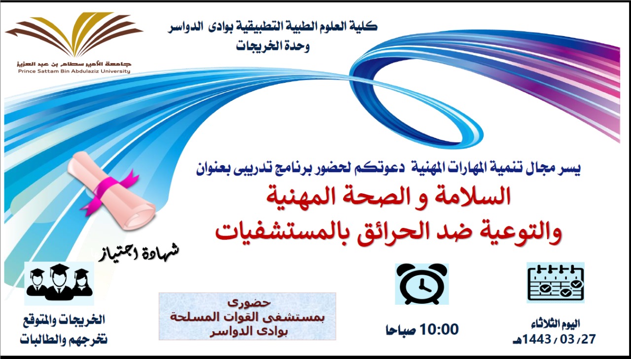 قامت وحدةالخريجات ممثله بمجال تنمية المهارات المهنية بكلية العلوم الطبيه التطبيقية بوادي الدواسر بالتعاون مع مستشفى القوات المسلحة بوادى الدواسر بعقد برنامج تدريبى بعنوان السلامة و الصحة المهنية والتوعية ضد الحرائق بمستشفى القوات المسلحة وذلك يوم الثلاثاء الموافق 1443/3/27وكانت الدورة موجهه للخريجات والمتوقع تخرجهم و الطلاب والطالبات . وكان هدف التوعية ضد الحرائق بالمستشفى بأقسامها المختلفة و طرق الوقاية منها و كيفية أستخدام طرق السلامة و الحفاظ على الصحة المهنية . وفي الختام تتقدم وحده الخريجين والخريجات بكلية العلوم الطبيه بجزيل الشكر والتقدير لسعادة الدكتورحسن ماجد مدير المستشفى القوات المسلحة بوادى الدواسر على دعم هذا البرنامج التدريبى وندعو الله له بدوام التوفيق والسداد ونسال الله التوفيق لابنائنا الطلبة والخريجين