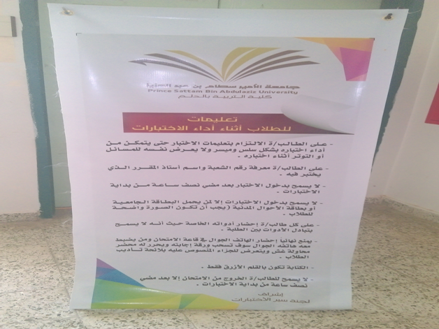 كذلك اثنت على التزام الكلية بنشر تعليمات ولوائح الاختبارات للطالبات في أماكن مختلفة بالكلية طبقاً لما ورد في دليل الاختبارات المعمم من قبل وكالة الشؤون التعليمية والأكاديمية بالجامعة.