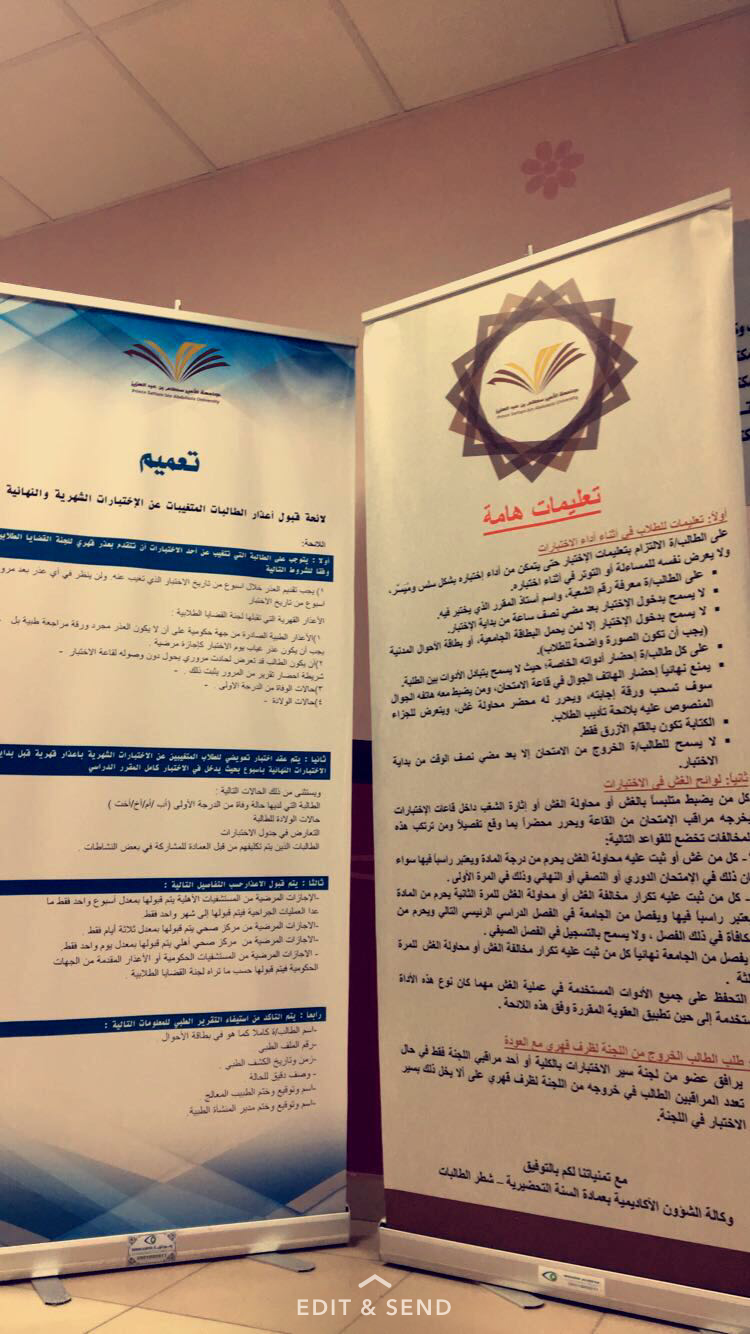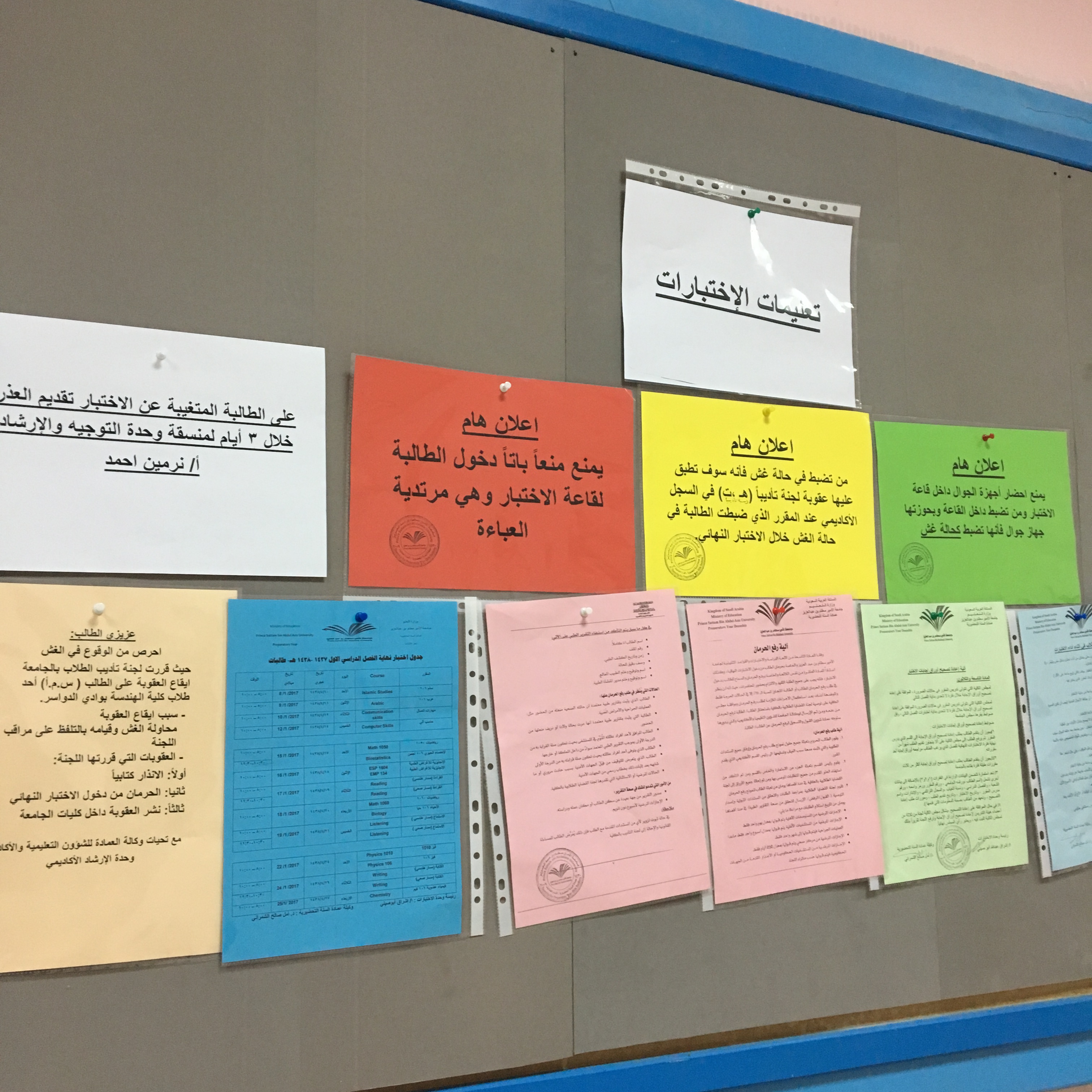 كذلك أثنت الأستاذة فاطمة الشاذل على التزام العمادة بنشر التعليمات ولوائح الاختبارات للطالبات في أماكن مختلفة طبقاً لما ورد في دليل الاختبارات المعمم من قبل وكالة الشئون التعليمية والأكاديمية بالجامعة