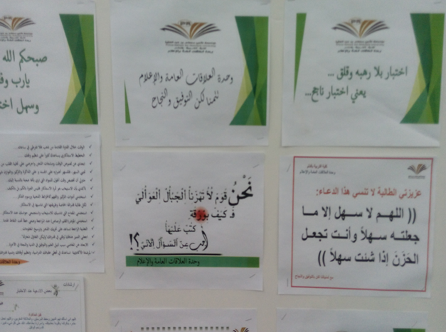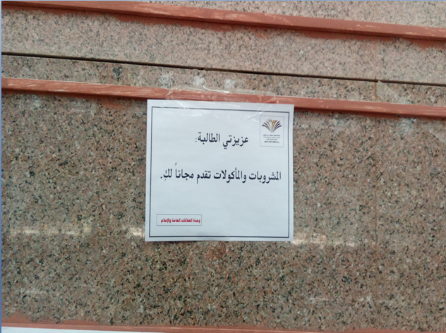 كما أعدت وحدة الإرشاد برئاسة د. هويدا عبد الفتاح لافتات توعوية متنوعة خاصة بالاختبارات، وتم توزيعها في أماكن بارزة بالكلية ، وأيضا قدمت وحدة العلاقات العامة والإعلام بالتعاون مع كافتيريا الكلية مبادرة تقديم وجبات خفيفة للطالبات أثناء فترتي الاختبارات النهائية.