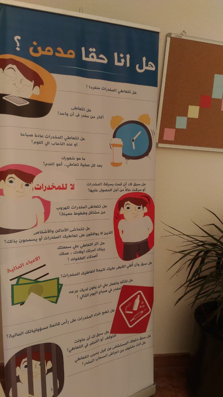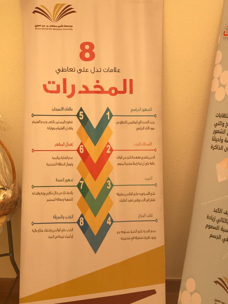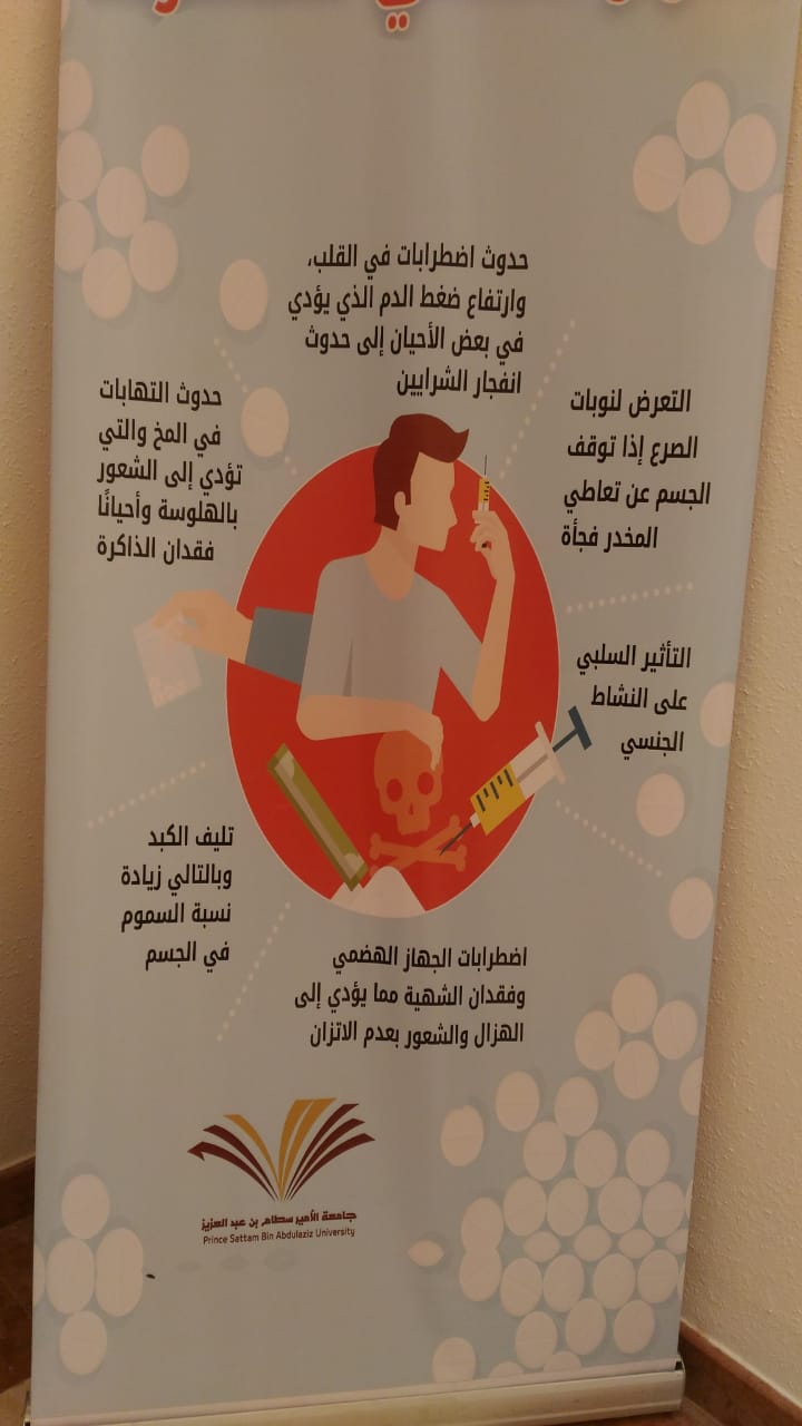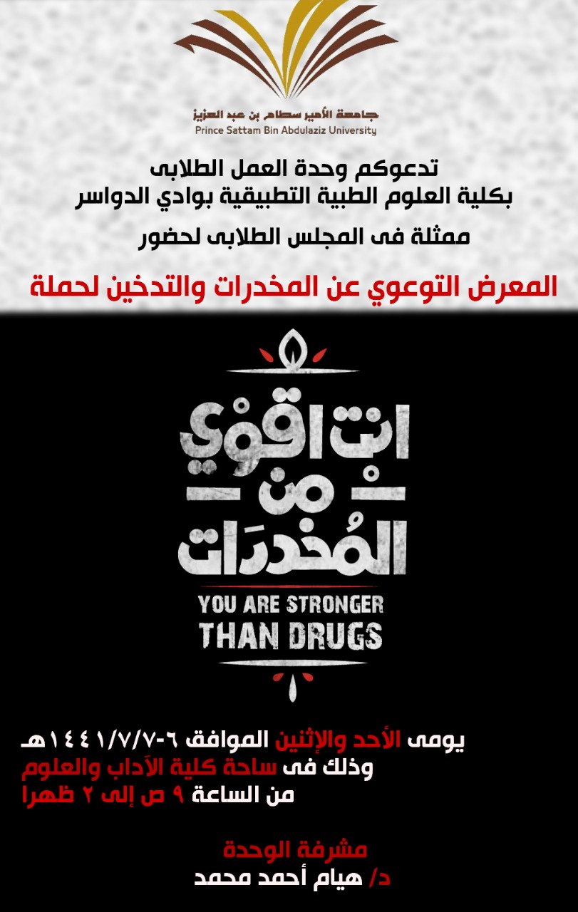 نظمت وحدة العمل الطلابي بكلية العلوم الطبية التطبيقية وادي الدواسر ممثلة فى المجلس الطلابي تحت إشراف مشرفة الوحدة د/هيام أحمد محمد المعرض التوعوي عن المخدرات والتدخين لحملة "أنت أقوى من المخدرات" وذلك يومى الأحد والإثنين الموافق ١٤٤١/٧/٧،٦ فى ساحة كلية الآداب والعلوم من الساعة ٩ صباحا إلى ٢ ظهرًا وكان الهدف العام للمعرض التوعية والوقاية من خطر المخدرات والتدخين وآثارهما الضارة على الفرد والمجتمع، وقد تضمن المعرض أركان عن أسباب تعاطي المخدرات، العلامات والأعراض التى تدل على التعاطي، بالإضافة إلى الأضرار الناتجة عن تعاطى المخدرات والتدخين وطرق الوقاية، هذا وقد لاقى المعرض إستحسان من قبل الطالبات الذى ظهر من خلال تعليقاتهم الإيجابية على لوحة شاركنا برأيك.