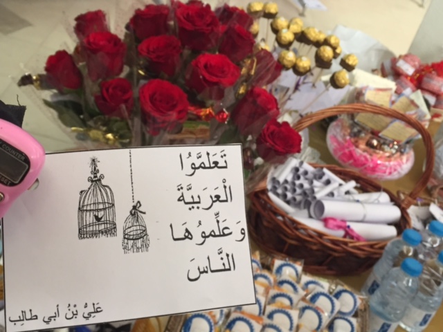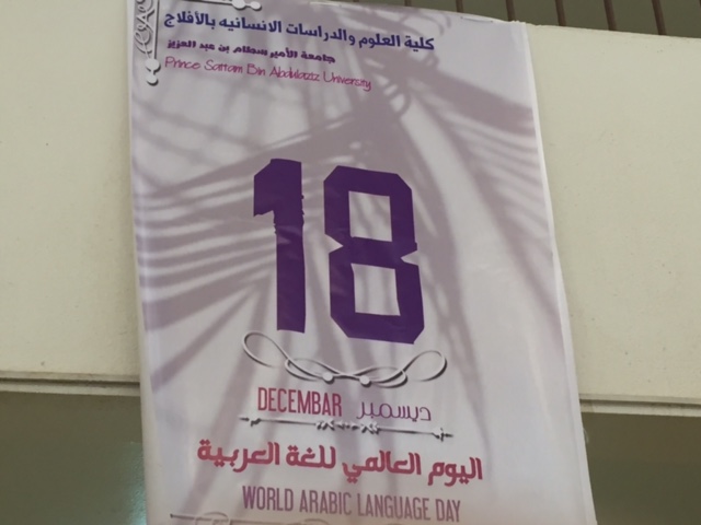 احتفل قسم اللغة العربية بكلية العلوم والدراسات الإنسانية بالأفلاج اليوم الأربعاء 1437/2/27هـ في تمام الساعة التاسعة في بهو المبنى ( أ ) باليوم العالمي الثامن عشر للغة العربية , بُدء الحفل بآيات مرتلة من القرآن الكريم ,بعد ذلك ألقت الدكتورة سعاد علي عبدالماجد رئيسة قسم اللغة العربية كلمة تحدثت فيها عن أهمية اللغة العربية و الاعتزاز بها , بعدها كانت مسيرة ترتيب الحروف قامت بها طالبات القسم , تلاها عرض فيديو عن تاريخ اللغة العربية و أهميتها , و بعدها تحدثت الدكتورة : ماجدة برعي بابكر عن المشكلات التي واجهت اللغة العربية وحاولت القضاء عليها وعلى عروبتنا و هويتنا العربية , كمشكلة العامية والفصحى و اللغات الأجنبية , ومزاحمة العامية للفصحى في كل مكان , كما تطرقت أيضاً لعلاجها للمحافظة على لغتنا الأم , و من هذه الحلول تجسيد مفهوم تعريب الحياة العربية , و بحديث راقٍ عن الفخر بلغة القرآن تحدثت الدكتورة : غادة فتحي , دعت إلى الابتعاد عن التعامل مع الألفاظ الأجنبية و إحياء اللغة العربية الفصحى , بعدها ألقت إحدى الطالبات شعر رثاء للغة العربية ترثي فيها حال لغتنا الأم في عصر التطور والتحضر و التمدن , يقابل الرثاء الفخر حيث ألقت إحدى الطالبات أيضاً أبياتاً تفخر فيها باللغة العربية .