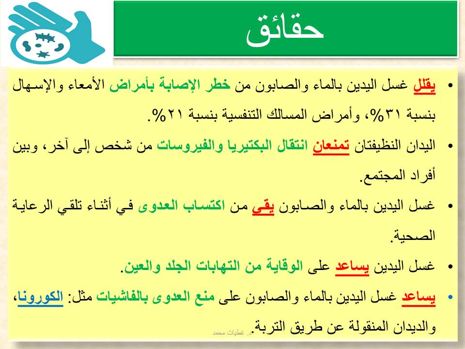 وتم تقديم عرض بوربوينت قدمته دكتورة عطيات محمد حسن (مشرفة الوحدة) احتوى علي مقدمة، أهداف اليوم العالمي ، حقائق أهمية غسل الأيدي و فوائدها و أوقاتها، عرض صور مأخوذة بالأشعة فوق البنفسجية توضح أهمية غسل اليدين بالصابون لمواجهة كورونا والجراثيم، تقديم عرض مرئي يوضيح أهمية تطهير الأيدي، عرض مرئي للطريقة الصحيحة لغسل الأيدي. أيضا: تم التطبيق لخطوات غسل الأيدي بالماء والصابون. وقد لاقت الفاعلية استحسان من الطالبات وذلك من خلال التفاعل بالمشاركة بتطبيق غسل الأيدي.